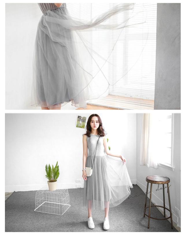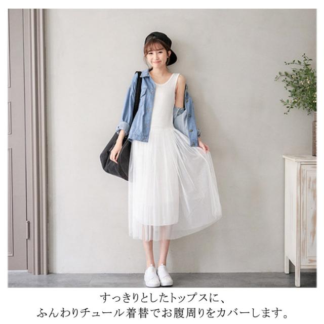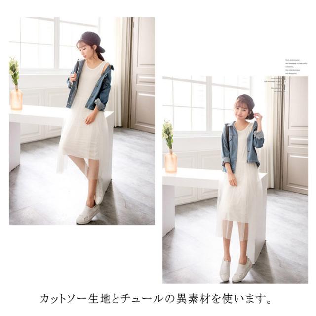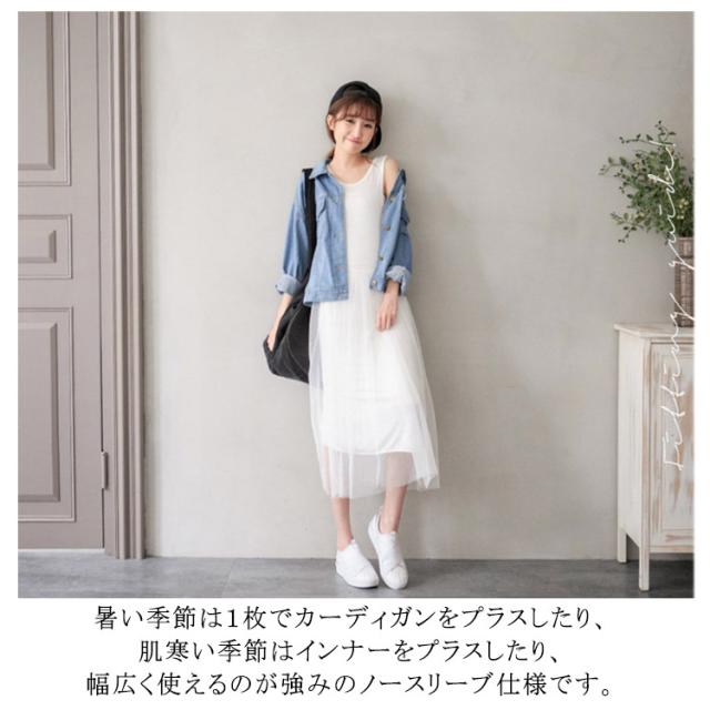 | 1枚で着たり、レイヤードで着たり、着回し上手なワンピースが登場します。 すっきりとしたトップスに、ふんわりチュール着替でお腹周りをカバーします。 暑い季節は1枚でカーディガンをプラスしたり、肌寒い季節はインナーをプラスしたり、幅広く使えるのが強みのノースリーブ仕様です。 カットソー生地とチュールの異素材を使います。 上品な質感なのでカジュアルなアイテムと合わせても大人っぽい雰囲気を演出してくれます。 | |