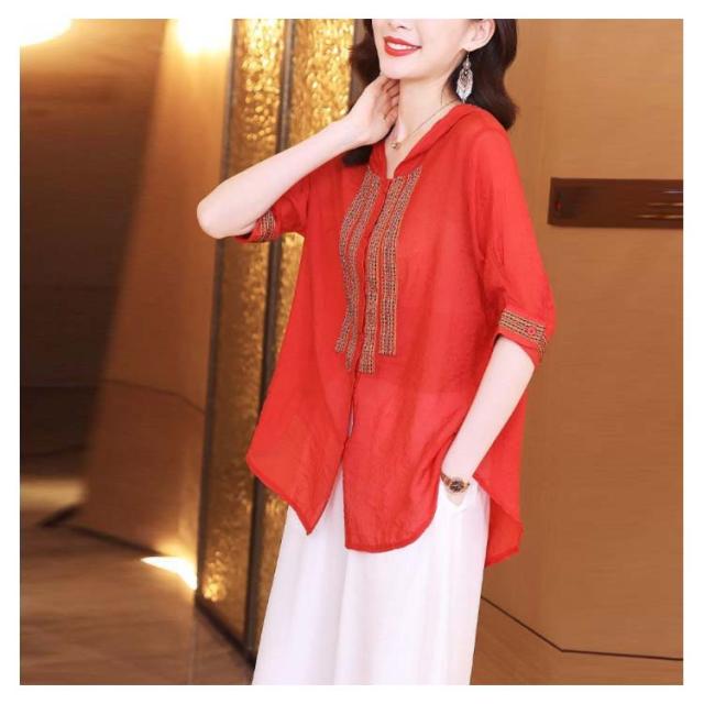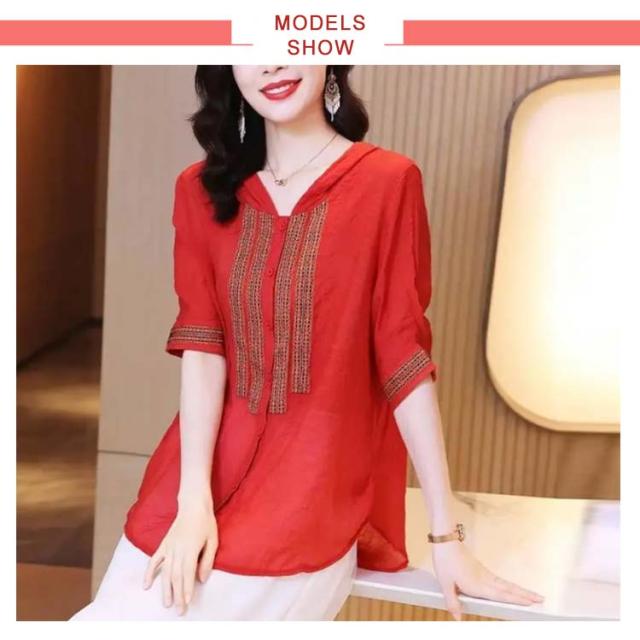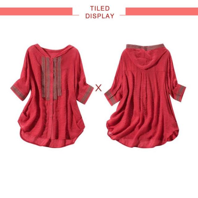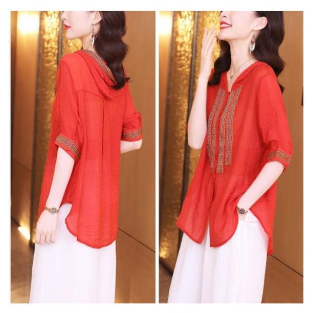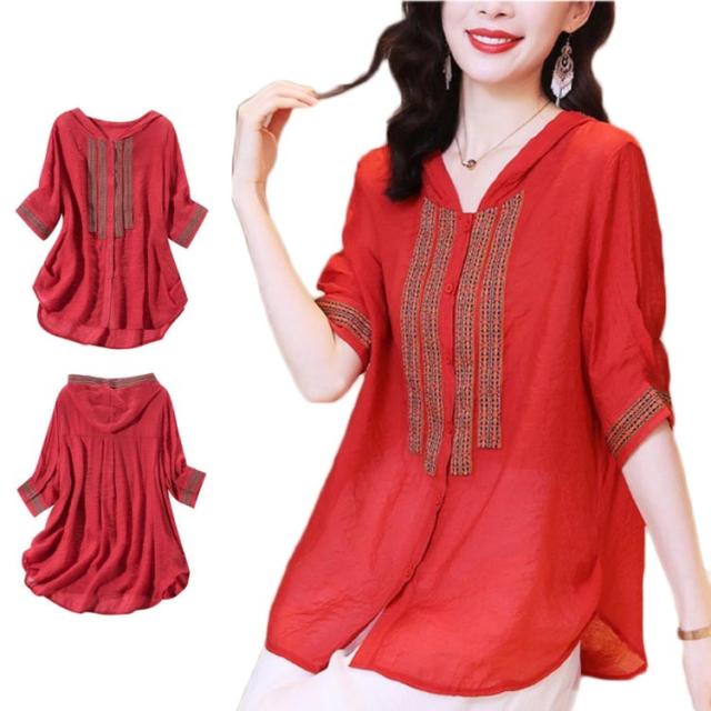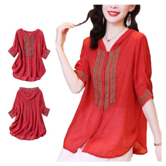 レディース おしゃれ ブラウス 夏 フード付きシャツ 刺繍ブラウス シャツ トップス 5分袖 リネン 綿麻 フード付き ゆったり 送料無料 シンプル カジュアル おでかけ お洒落 リゾート 普段着
