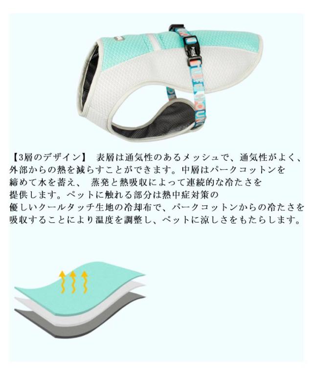 | 【メッシュ生地】 クールベストは高品質の冷感生地で作られ、快適に着用し、肌に優しい。熱を素早く蒸発させて吸収することで温度を調整するという物理降温を採用して、 ペットに涼しくて快適な夏を過ごします。生地は化学薬品が含まれない、安全で刺激のない繊維を採用、軽く、通気性も抜群。ペットに安心なベスト。 【3層のデザイン】 表層は通気性のあるメッシュで、通気性がよく、外部からの熱を減らすことができます。中層はパークコットンを締めて水を蓄え、 蒸発と熱吸収によって連続的な冷たさを提供します。ペットに触れる部分は熱中症対策の優しいクールタッチ生地の冷却布で、パークコットンからの冷たさを吸収することにより温度を調整し、ペットに涼しさをもたらします。 【反射テープ付き】肩や背中の反射帯は、雨の日や夜に犬を散歩させる時も安全。ハーネス紐口付き、ハーネスと同時に装着可能。日字デザインのバックル、調節簡単。クール服は水に浸漬しない場合、一般的な犬服としてもOK。四季問わず着用できます。 【サイズ調節可能】背中のストラップでサイズを調節でき、犬に最快適な様子まで調節してあげることができます。着脱しやすいです。 【夏に大活躍】万が一猛暑の日時、冷蔵庫にちょっと冷やしたら、もっと涼しくなるできます。ペットと散歩、ちょっとお出かけ、スポーツ、登山などのオススメ必要品。真夏の散歩はこの熱中対策グッズでペットを守ろう。 【使用方法】 1.水に浸して、もし冷感強化が必要の場合、冷蔵庫に10分ほど置く 2.余分の水を絞る 3.愛犬に装着 ご注意:水に浸したクールベストとして使用の場合、風邪を引くことが防止するため、必ずワンちゃんに注意します。連続長時間使用のがオススメない。ベストは干す状態の場合、普通の服として長時間ペットに着用でもOK。 | |