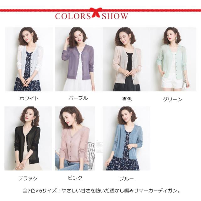 | 全7色×6サイズ!やさしい甘さを紡いだ透かし編みサマーカーディガン。 首元はVネックで、顔周りをスッキリと見せてくれます。 フェミニンな透かし編みデザインがいつもの着こなしに自然と馴染む、ナチュラルな甘さです。 さらに視覚効果で脚長に見せてくれる短丈タイプ。 薄手だから避暑地への旅行や機内の寒さ対策にピッタリ。 カジュアルからキレイ目まで使える万能itemです。 | |