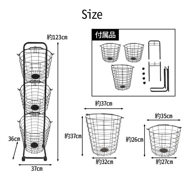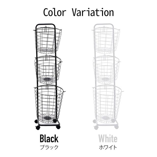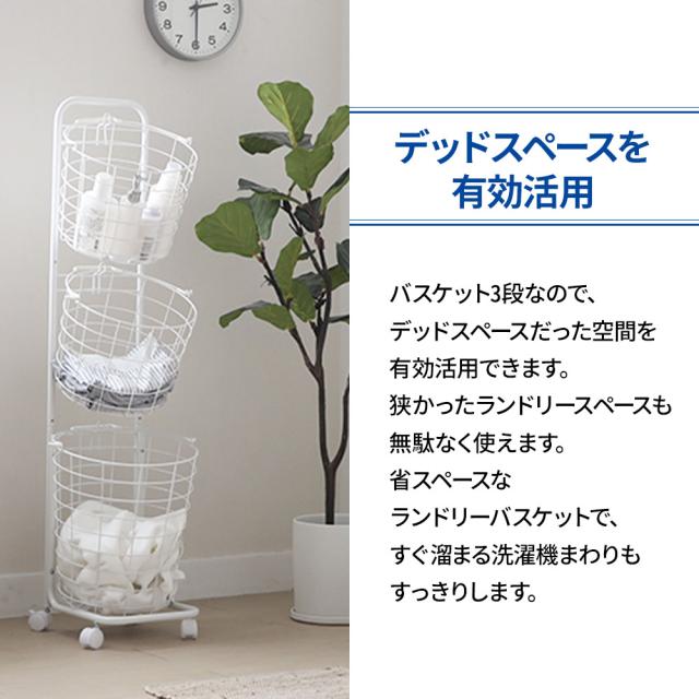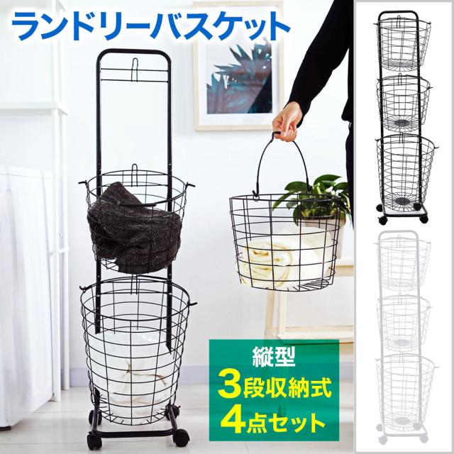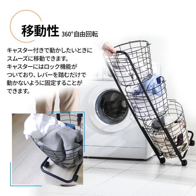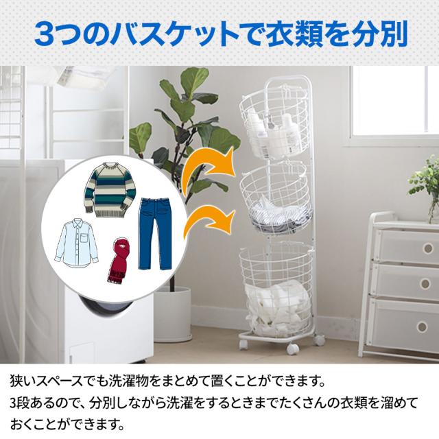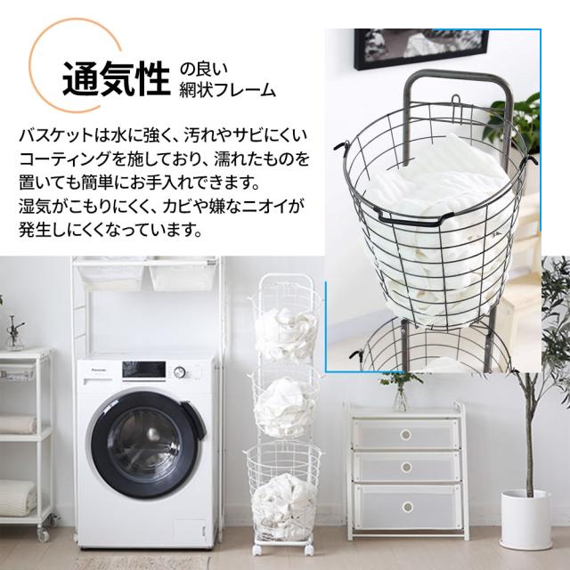 ランドリーバスケット 3段 キャスター 洗濯カゴ 丸形 丸型 バスケット付 ランドリーワゴン ランドリーラック ハンドル 持ち手 ワイヤー ラック ワゴン 大容量 収納 洗濯かご