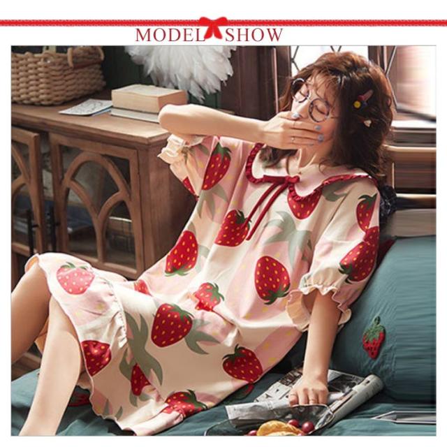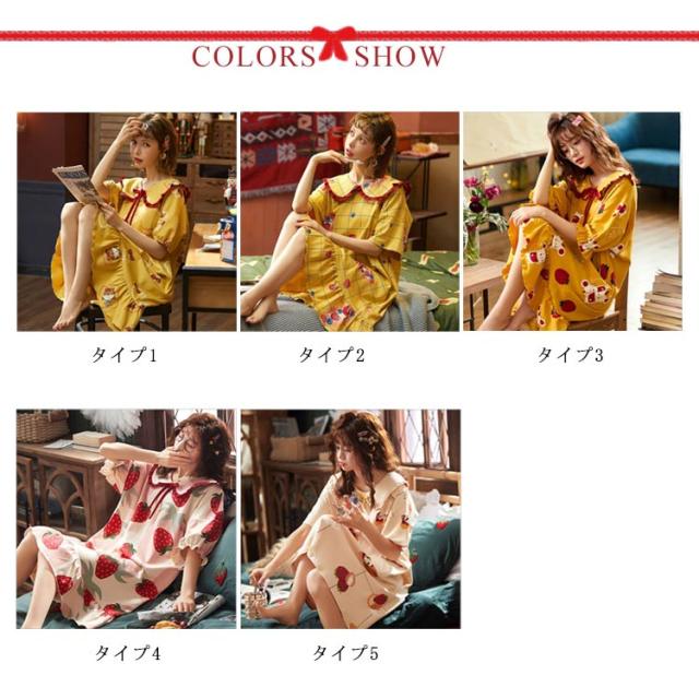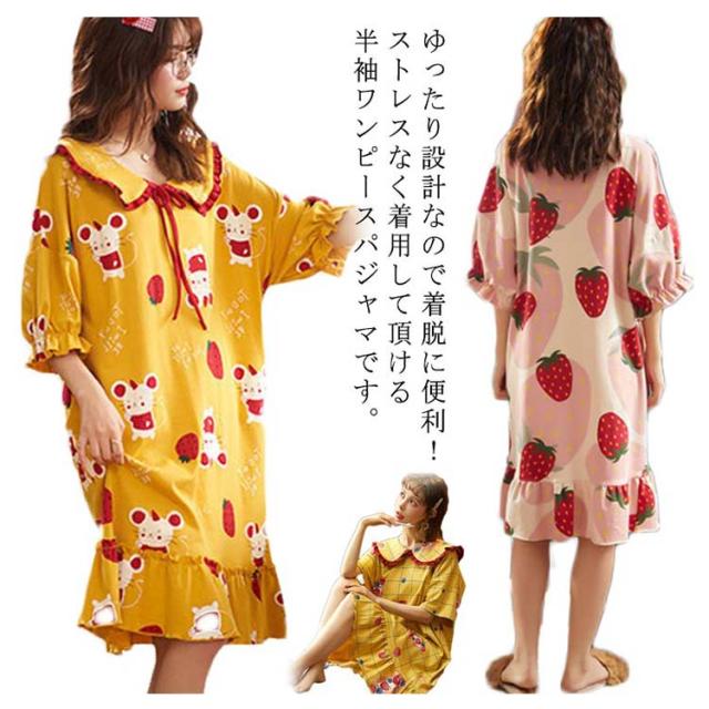 パジャマ ワンピース レディース 半袖 春夏 リボン 苺柄 部屋着 ルームウエア ナイトウエア 襟付き ミモレ丈ワンピース ロング 綿 部屋着 半袖 きれいめ ゆったり 春夏秋 薄手