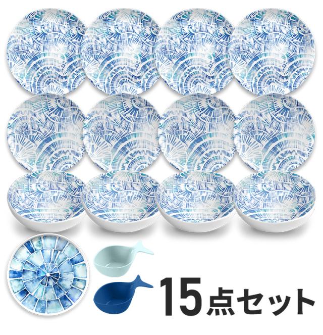 コースタルスカロップ 15点セット メラミン食器 割れにくい おしゃれ 食洗機対応 ボウル お皿 深皿 可愛い 電子レンジ不可 食洗機対応 食器セット プレート(代引不可)【送料無料】
