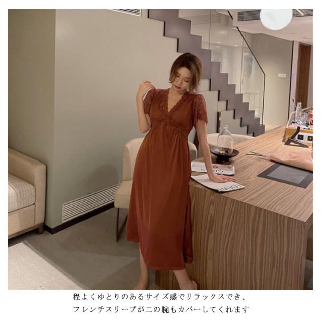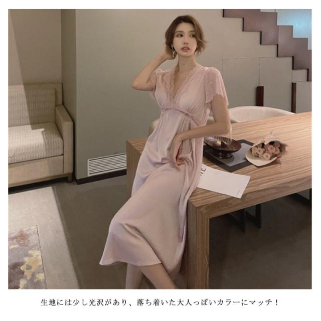【送料無料】セクシー ルームウェア ランジェリー ワンピース 部屋着 レース Vネック フレンチスリーブ サテン スリップ ツヤツヤ シースルー 下着 レディース パジャマ 寝巻き