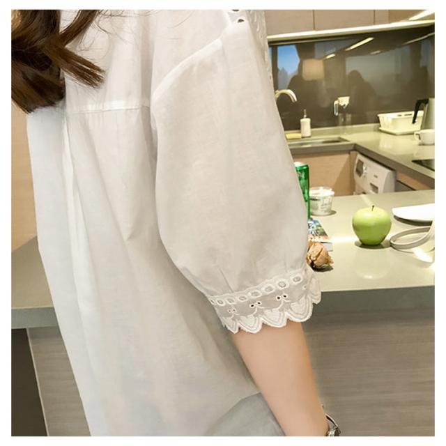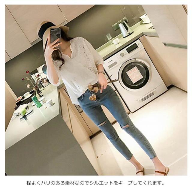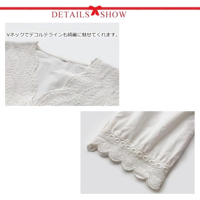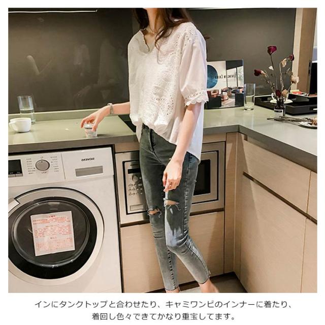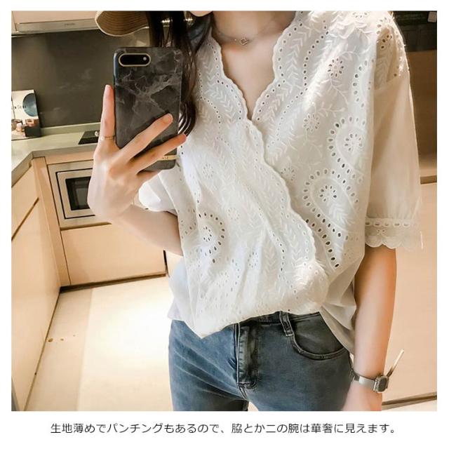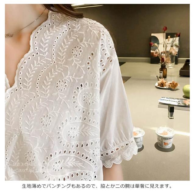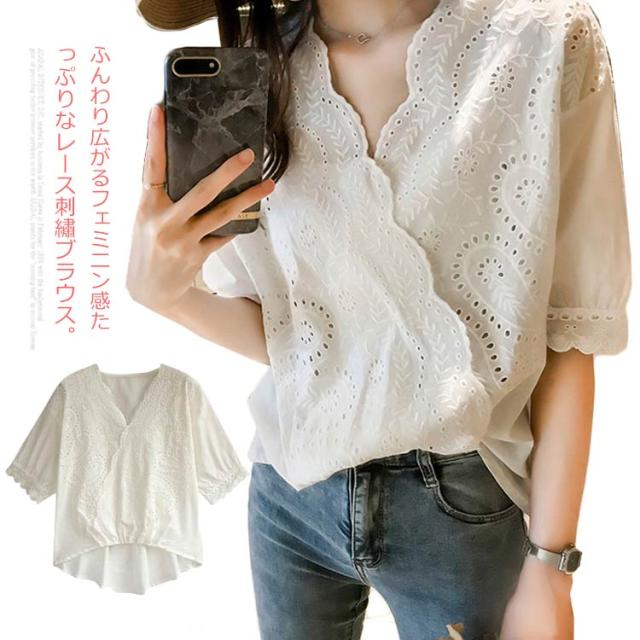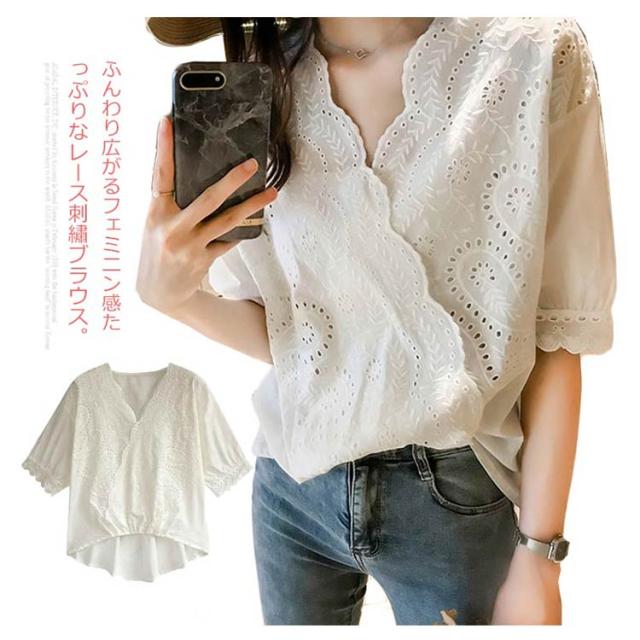 【送料無料】ブラウス プルオーバー レディース トップス シャツ 刺繍 レース 透かし編み Vネック ラウンドテール ギャザー 夏 デコルテ 5分袖 おしゃれ きれいめ 楽ちん 着回し お洒落 オフィスカジュアル