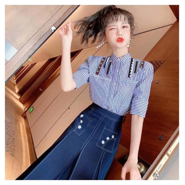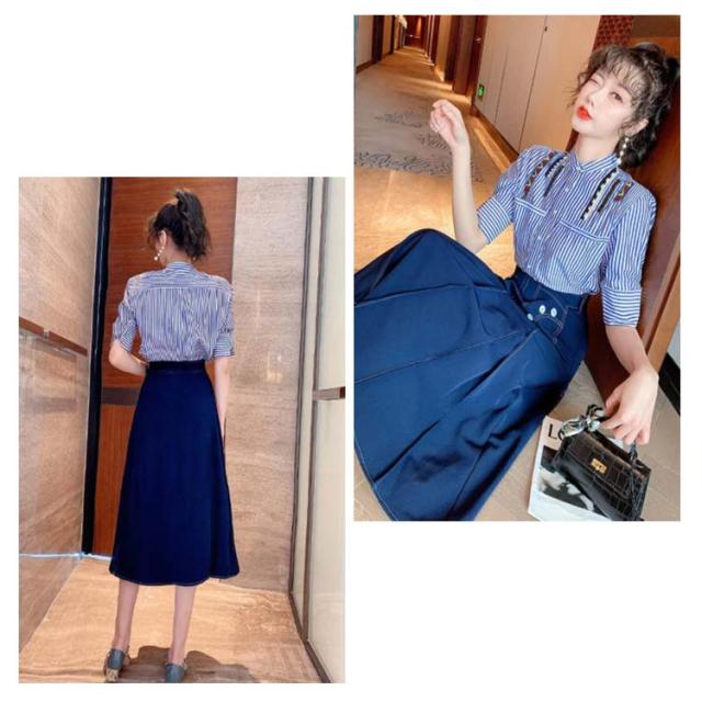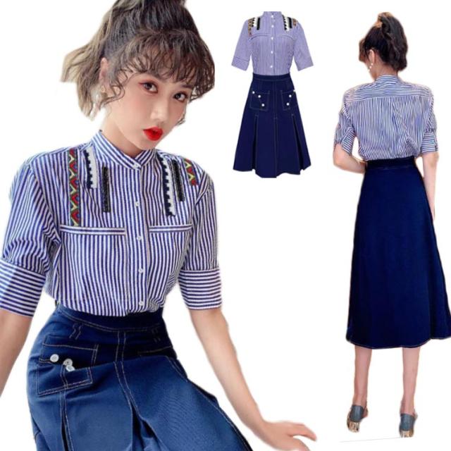 レディース セットアップ 半袖 スカート 夏 2点セット トップス ボーダーシャツ デニムスカート ロングスカート ボーダー柄 送料無料 シンプル カジュアル 着痩せ