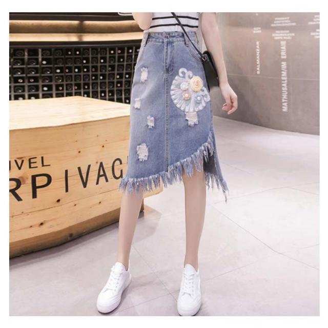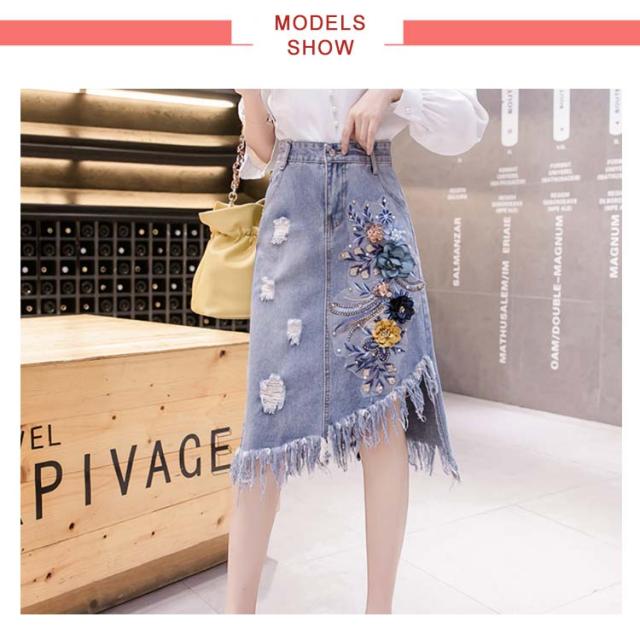 スカート?レディース デニムスカート?ミディアム丈 プリンジ デニム ハイウエスト ダメージ オシャレ 刺繍スカート プリーツスカート ロングスカート?デニム 春 夏?ウエストゴム? Aライン?送料無料