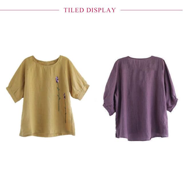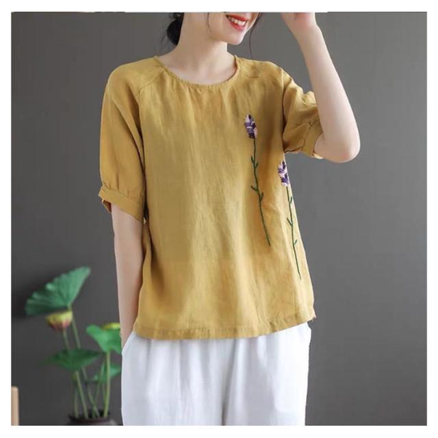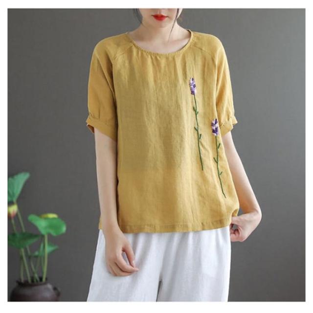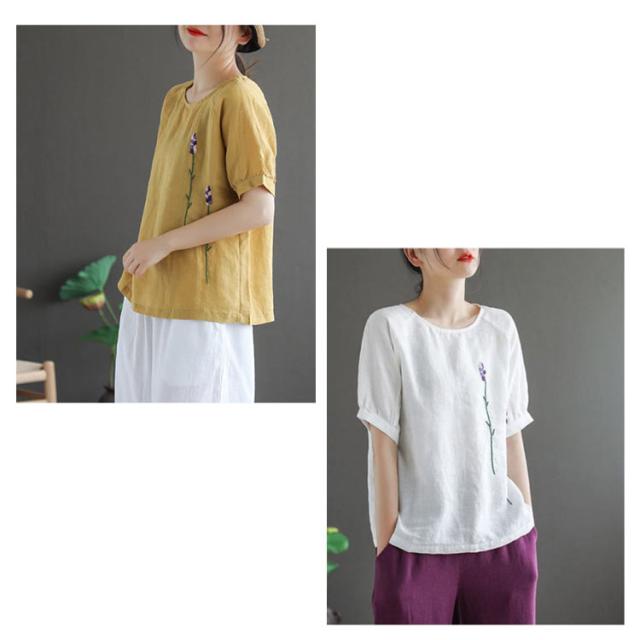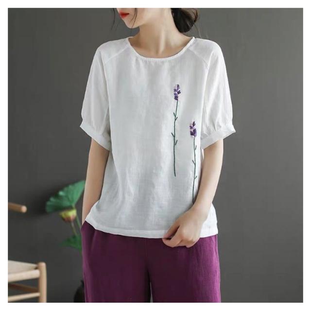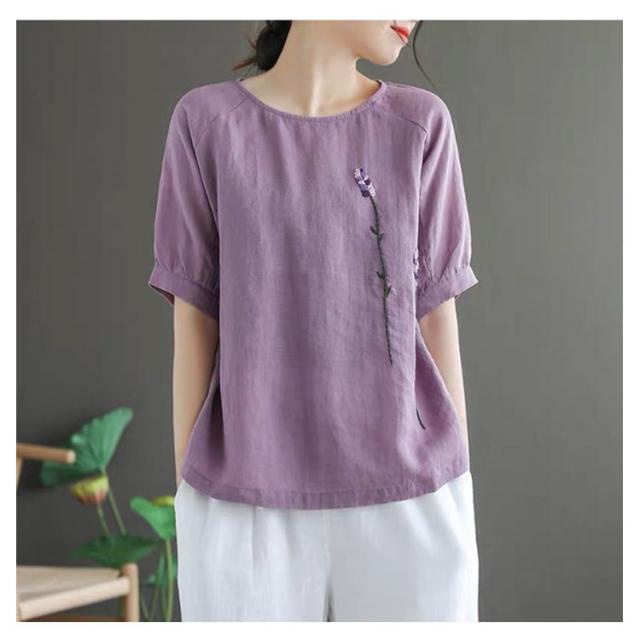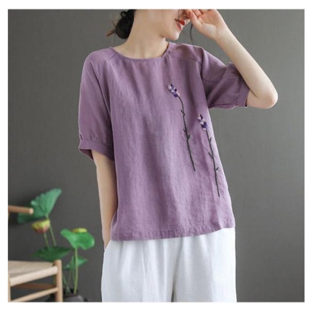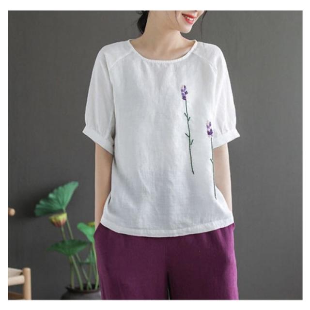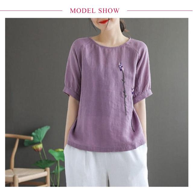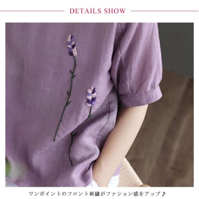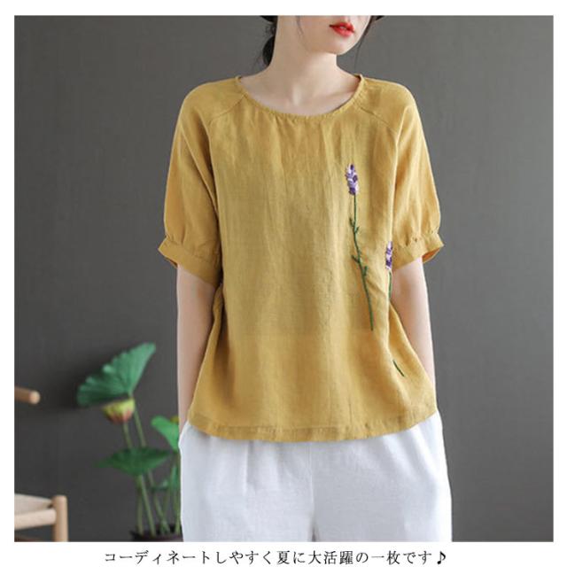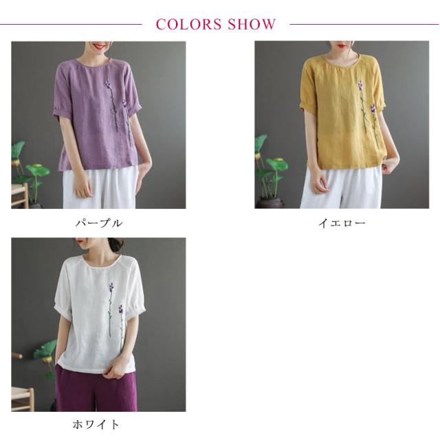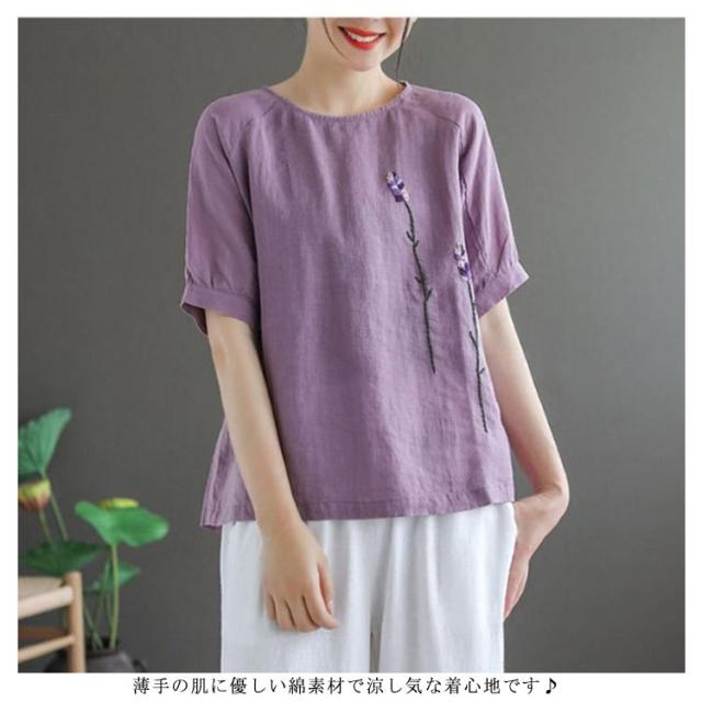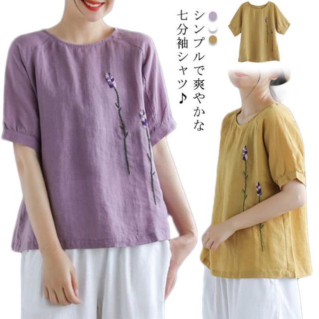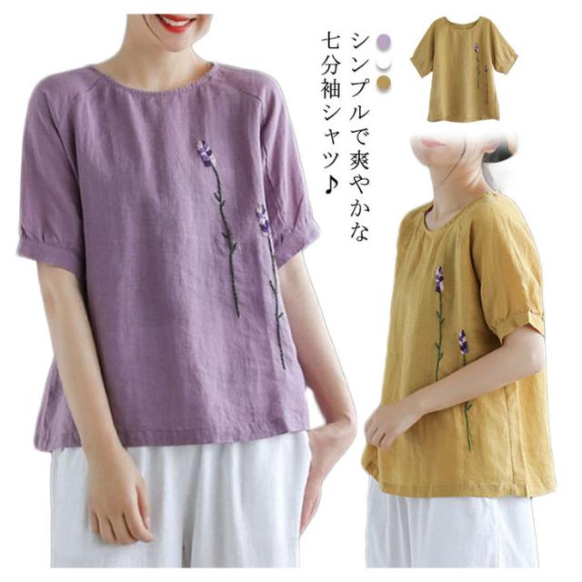 刺繍シャツ ブラウス レディース シャツ トップス 七分袖 Tシャツ プルーオーバー クルーネック ゆったり 五分袖 ラグランスリーブ ふんわり 送料無料 薄手 涼しげ おしゃれ カジュアル 夏