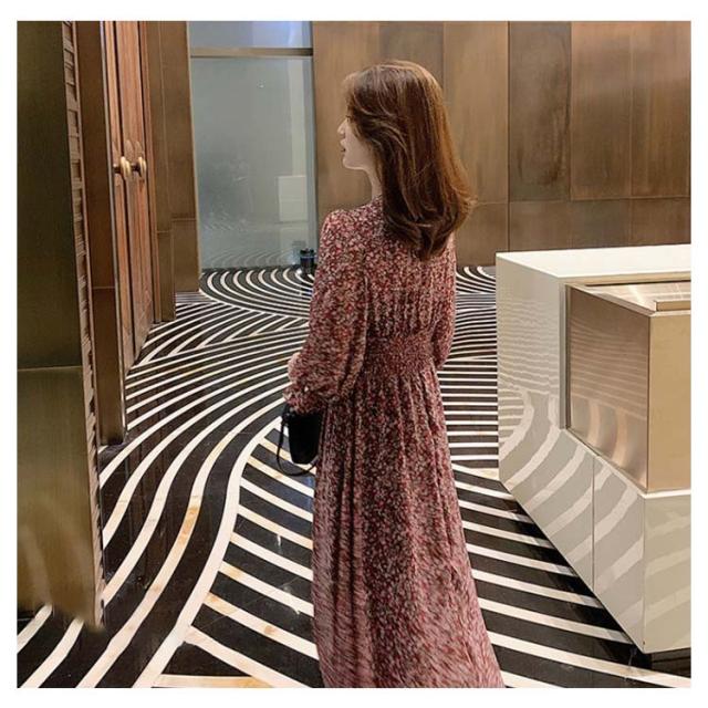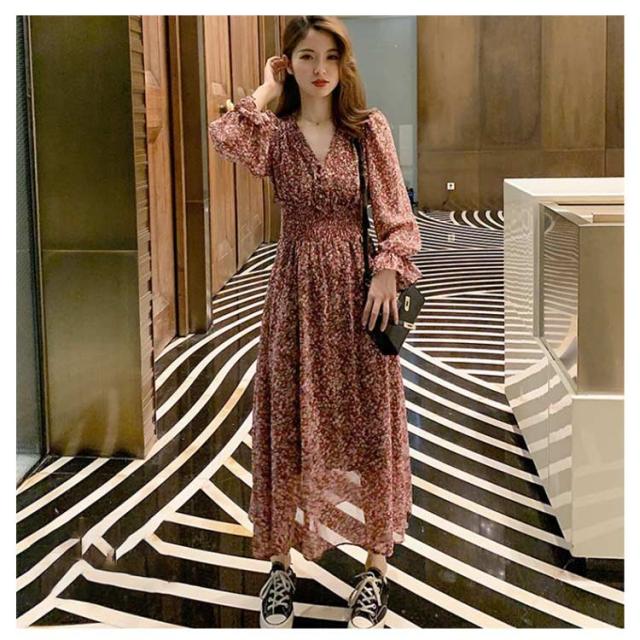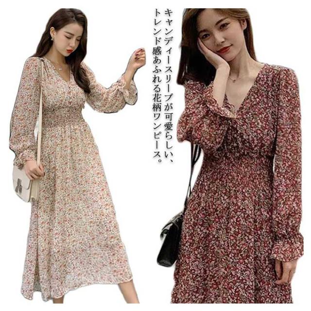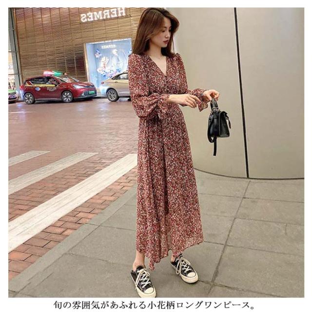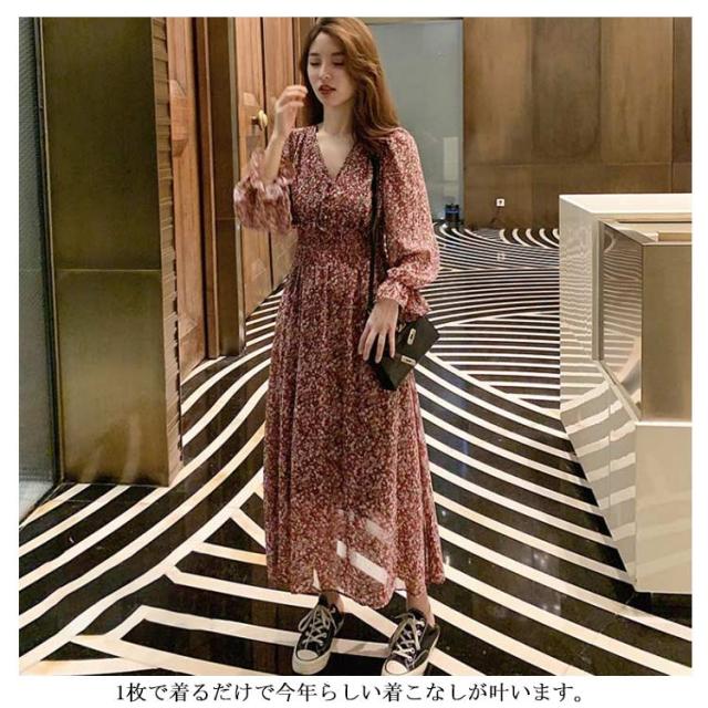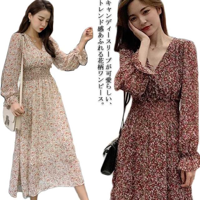 送料無料 ワンピース レディース 花柄ワンピース ロングワンピース 長袖 マキシワンピース 総柄 バルーンスリーブ フレアワンピース ウエストゴム ロング丈 Vネック Aライン 着痩せ かわいい 体型カバー 清楚