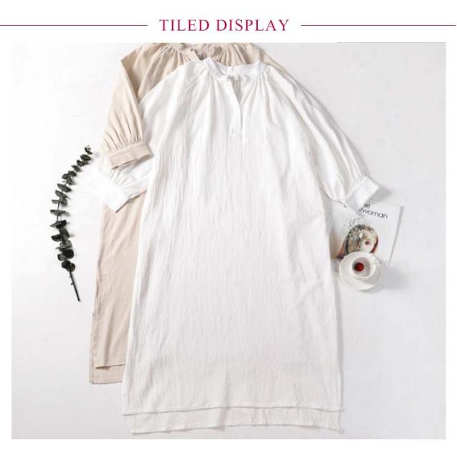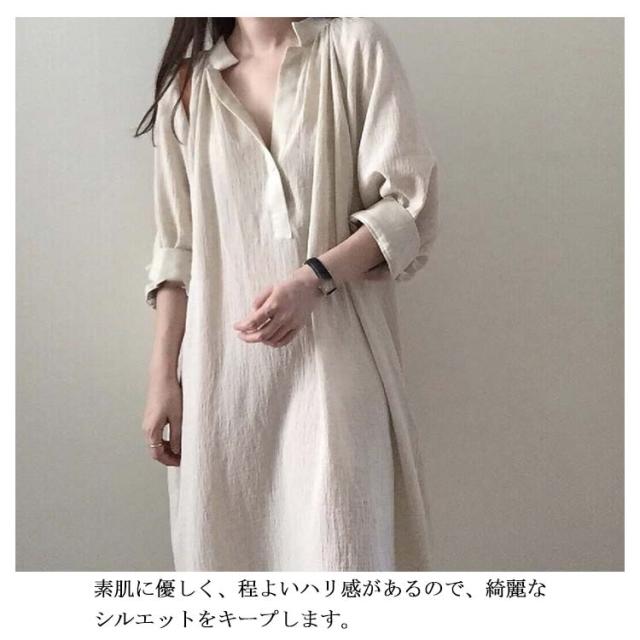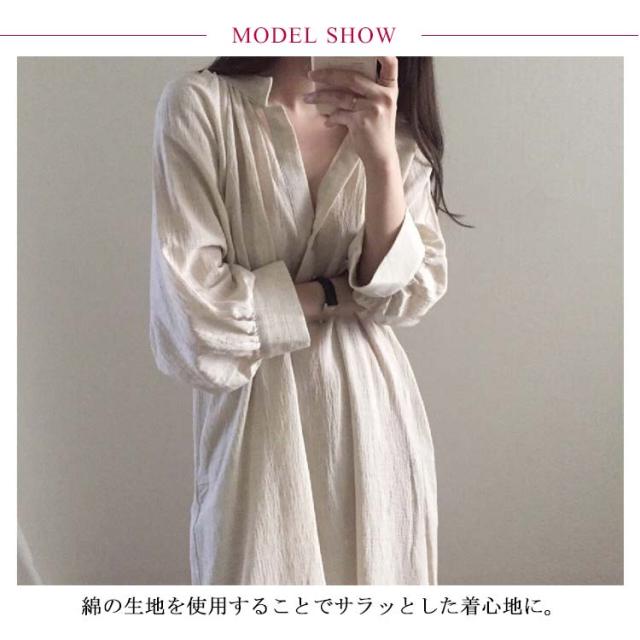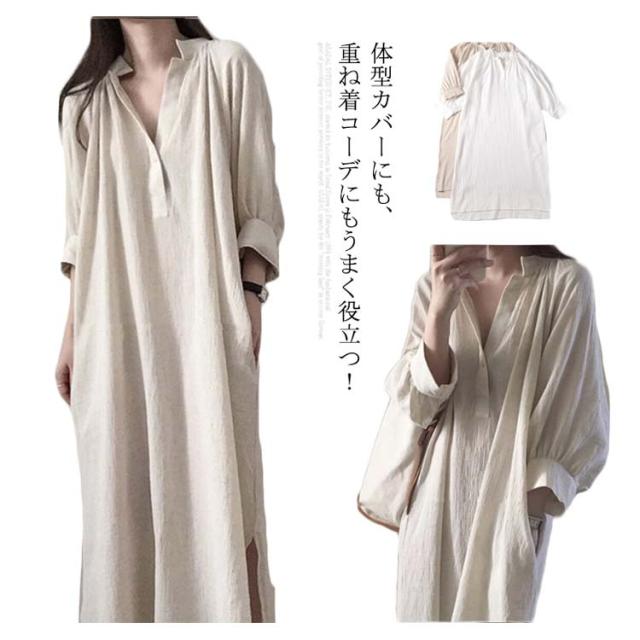 ワンピース レディース シャツワンピース 秋 五分袖 綿 麻 Vネック 麻風 ロングワンピース【送料無料】韓国風 春夏秋 ミモレ丈 ロング丈 マキシ丈 無地 ゆったり コットン 通勤