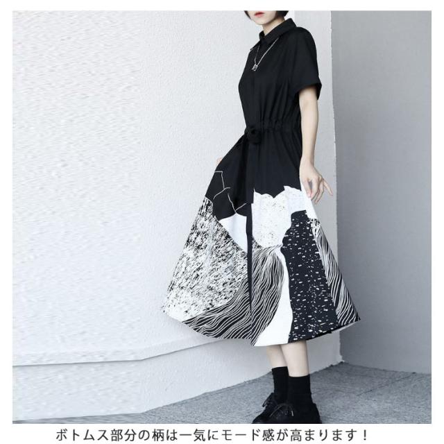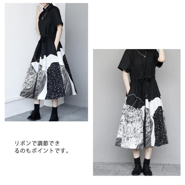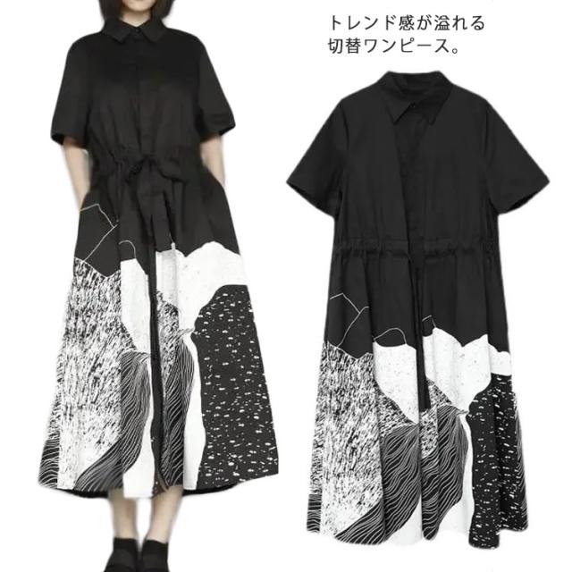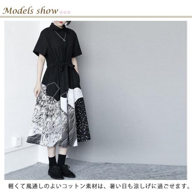 シャツワンピース 半袖 レディース ロングワンピース 送料無料 切替 ロング丈 マキシ丈 シャツワンピ コットン ゆったり Aライン リボン付き 体型カバー 大きいサイズ 柄 きれいめ おしゃれ 原宿風 春夏秋