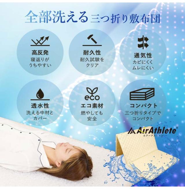 高機能素材 エアーアスリート 3つ折り マットレス ダブル 洗える 洗濯機 綿100% 日本製 体圧分散性 高反発 通気性 透水性 耐久性 洗える 防臭 へたりにくい 蒸れにくい 樹脂 ファイバー 三つ折り(代引不可)【送料無料】