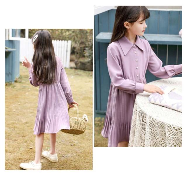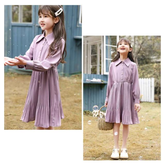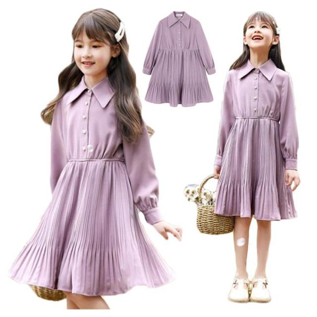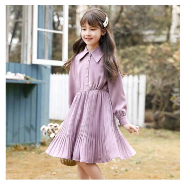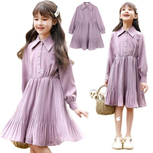 ロングワンピース キッズ 春 秋 プリーツワンピース 折襟 シャツワンピース フレアワンピース 長袖 ロングワンピ インナーワンピース インナーウエア 女の子 子供服 送料無料 無地 シンプル カジュアル オシャレ 姫系