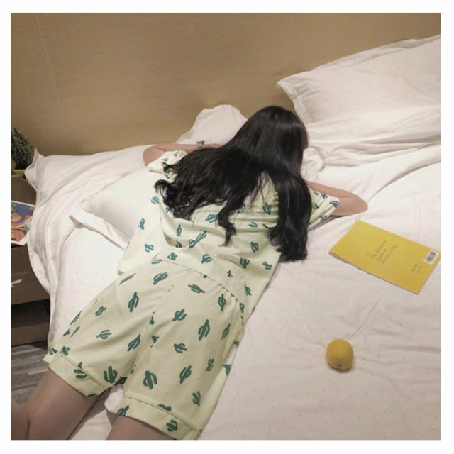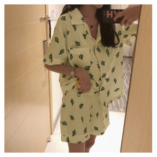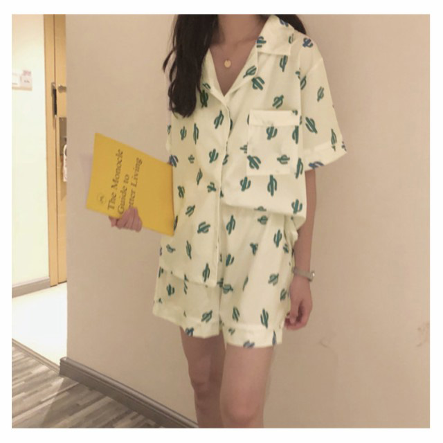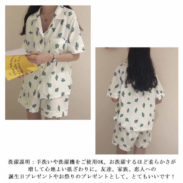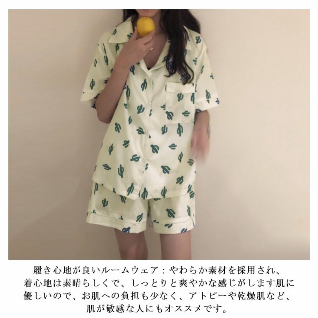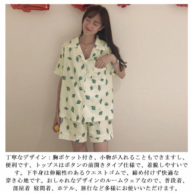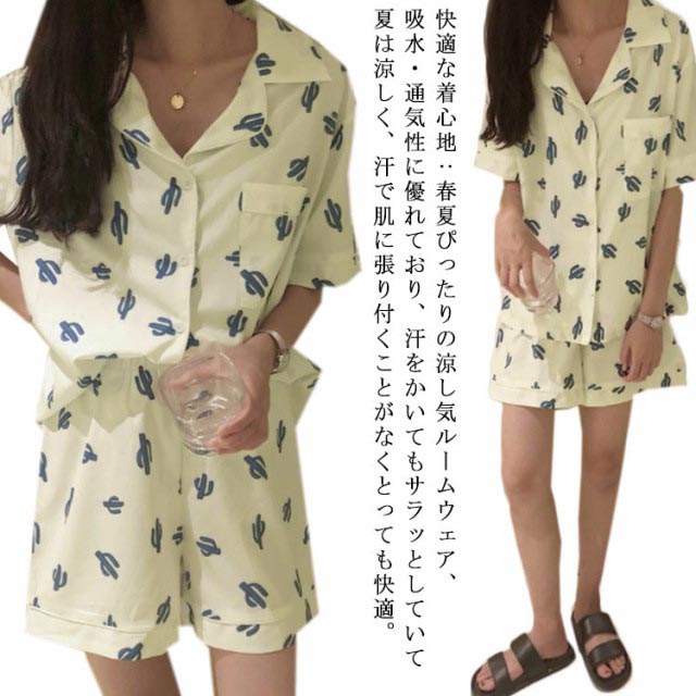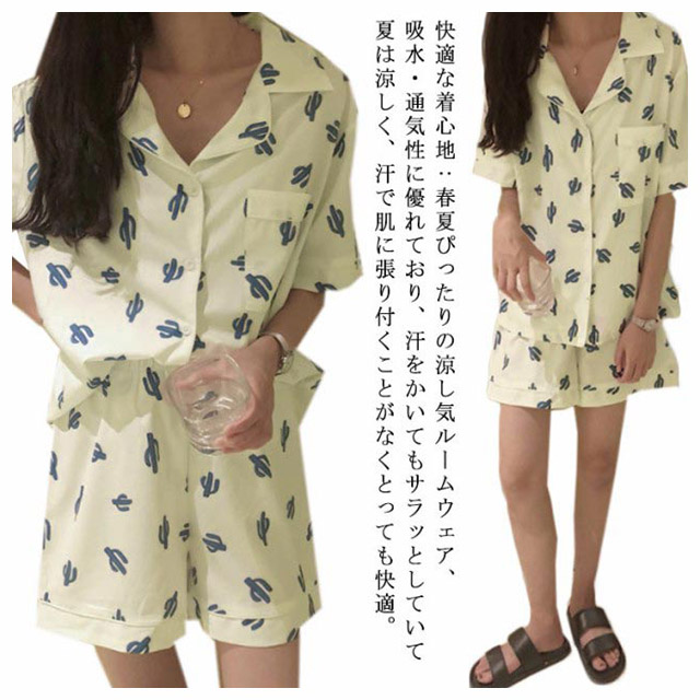 レディース パジャマ 半袖 サボテン柄 短パン 半ズボン 綿 夏用 上下セット セットアップ 薄手 涼しい ルームウエア 部屋着 寝巻き おうちコーデ ガーゼ 襟付き 春 夏 ポケット付き ナイトウエア コットン