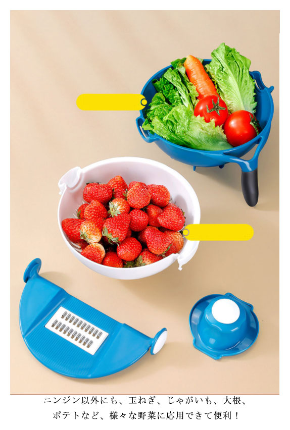| 野菜の下ごしらえはこれ1台ですべてOK!様々な野菜に応用できて便利! ニンジン以外にも、玉ねぎ、じゃがいも、大根、ポテトなど、様々な野菜に応用できて便利! アップグレード、本体強化、双層デザイン、より丈夫で、耐える力が強い、耐用性、全面的の野菜調理器 安全ホルダー付き。指が直接食材に触れずに野菜を切ることができます。特に子供が使う時怪我を防止することができます。 さまざまな食材に合わせて、切れる厚み調節機能が付いていれば人?工学を基づいて滑り止めクッションを設計しました。 磨滅に耐え、気軽に切り替え、使うと気楽になりました。 食品レベルの原材料、五つの鋭い高品質のステンレス製ブレードからなっておりますので、清潔感があり、切れ味が良く、どんなキッチンにも合います。 取り替えの五つブレード、ステンレス製、切れ味抜群、鋭いで、洗う時に気をつけてください。 | |
