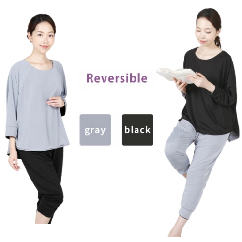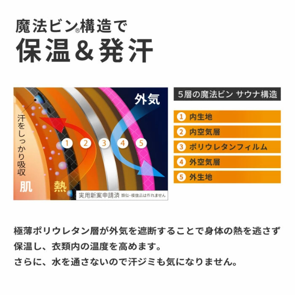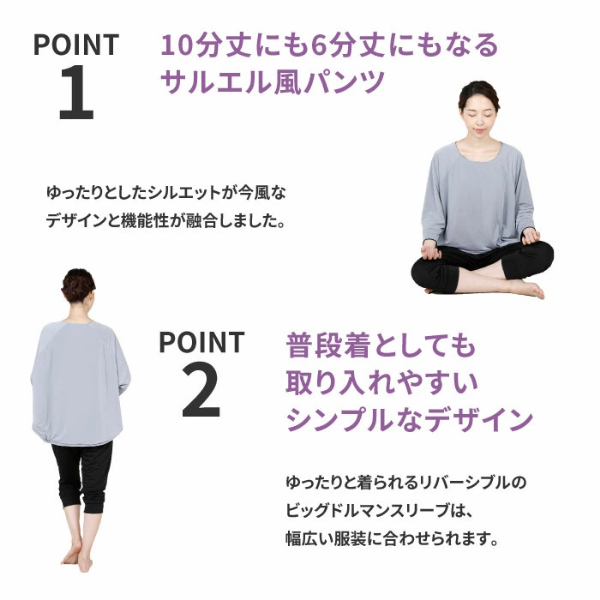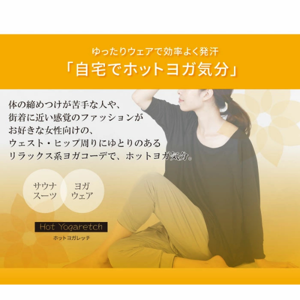 自宅でまったりホットヨガ気分!ゆったりウェアで効率よく発汗。体の締めつけが苦手な人や、街着に近い感覚のファッションがお好きな女性向けのウエスト・ヒップ周りにゆとりのあるリラックス系ヨガコーデでホットヨガ気分。■POINT[1]10分丈にも6分丈にもなるサルエル風パンツ。ゆったりとしたシルエットが今風なデザインと機能性が融合しました。■POINT[2]普段着としても取り入れやすいシンプルなデザイン。ゆったりと着られるリバーシブルタイプのビッグドルマンスリーブは、幅広い服装に合わせられます。●魔法ビン構造で保温&発汗。5層の魔法ビン、サウナ構造![1]内生地[2]内空気層[3]ポリウレタンフィルム[4]外空気層[5]外生地。極薄ポリウレタン層が外気を遮断することで身体の熱を逃さず保温し、衣類内の温度を高めます。さらに、水を通さないので汗ジミも気になりません。