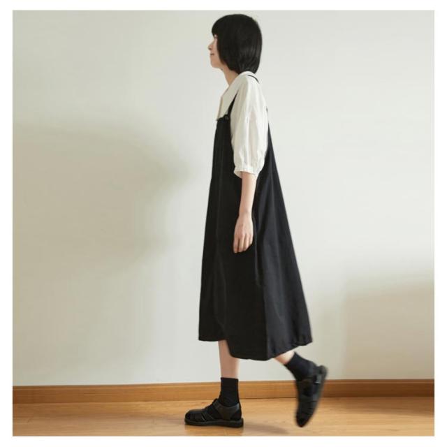 | リラックスして着れるサロペットワンピース。 全体ゆったりとしたワイドシルエットでストレスフリーな穿き心地です。 やわらかく、ナチュラルとした綿生地で、こなれ感も演出。 広がりすぎず、膝下ぐらいにかかる丈さで足首周りがキュッと細く見える効果あり♪ 今季はtシャツやブラウス、寒い時にニットなどと合わせてもOK。 春夏デイリーにピッタリな、大人可愛いアイテムです。 | |