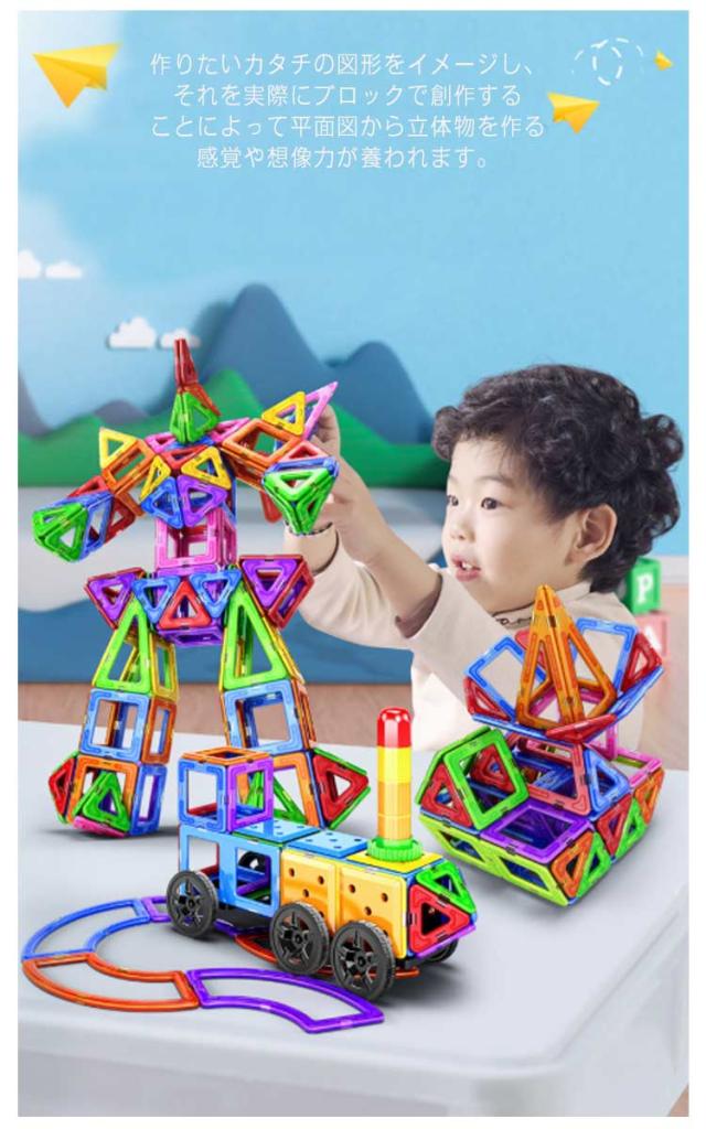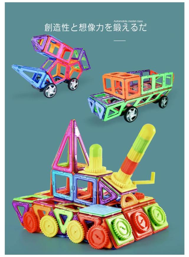 | マグネットで接続するブロックです! 作りたいカタチの図形をイメージし、それを実際にブロックで創作することによって平面図から立体物を作る感覚や想像力が養われます。 磁石で接続するので組み立てや取り外しも簡単、お子さまの想像力でたくさんの作品を創作できます。 | |