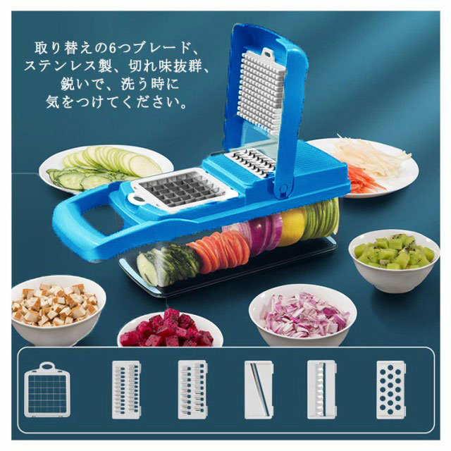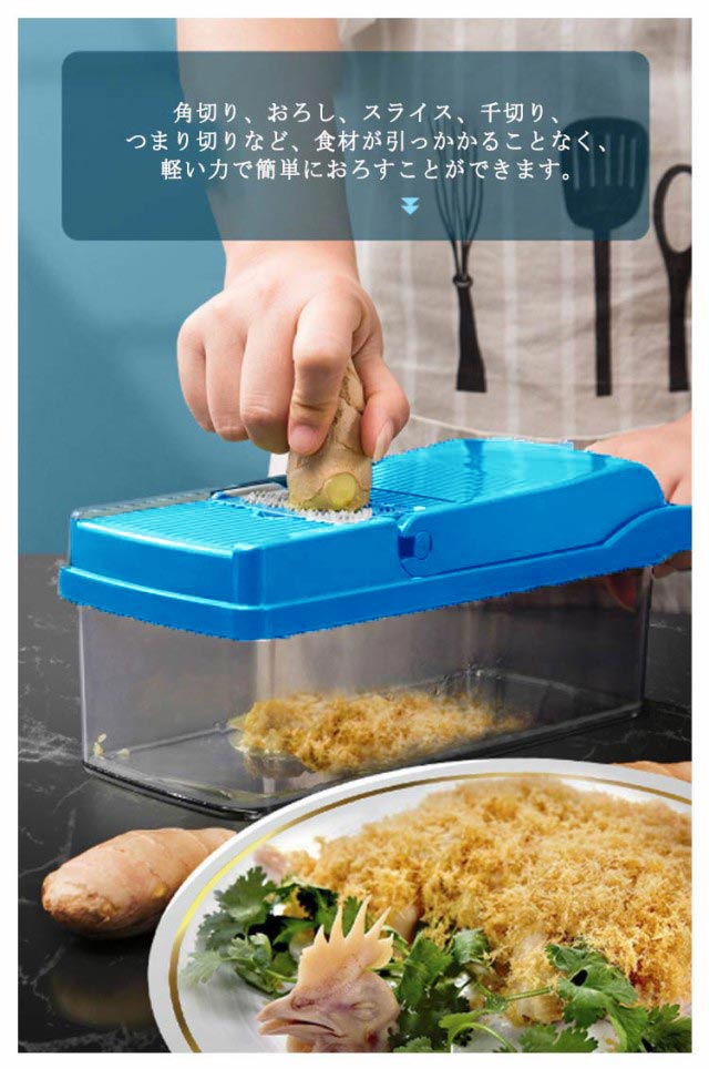 | 【ABS食品レベルの材料】剛性に優れ、耐衝撃性、曲げ疲労性、耐熱性引っ張りなどに強い、耐熱温度70℃、表面の光沢性に優れており、塗装なしでも高品質な質感を出せる。 【おろし作業はこれ1つ】 オロッソ はチーズ、生姜、ニンニク、チョコレート、柑橘類など、様々な食材に幅広く使える万能調理器具です。食材の魅力を最大限に引き出し、お料理の幅がグンと広がります。 【プロなガジェット】 取り替えの6つブレード、ステンレス製、切れ味抜群、鋭いで、洗う時に気をつけてください。角切り、おろし、スライス、千切り、つまり切りなど、食材が引っかかることなく、軽い力で簡単におろすことができます。 【多機能野菜スライサー】料理作業を手早く、楽にしてくれます。 人参はつかみやすくスライサーを使うとこんなにきれいに細く切ることができます。透明な収納ボックス、安全材質、便利、厚い、洗いやすい。 【お友達にもおススメ】 スライサーは食材のスライスやみじん切りなどを簡単に行える便利なキッチンアイテム、料理にかかる時間や手間を減らせるので、料理好きの方はもちろん料理初心者の方にもおすすめです。 | |