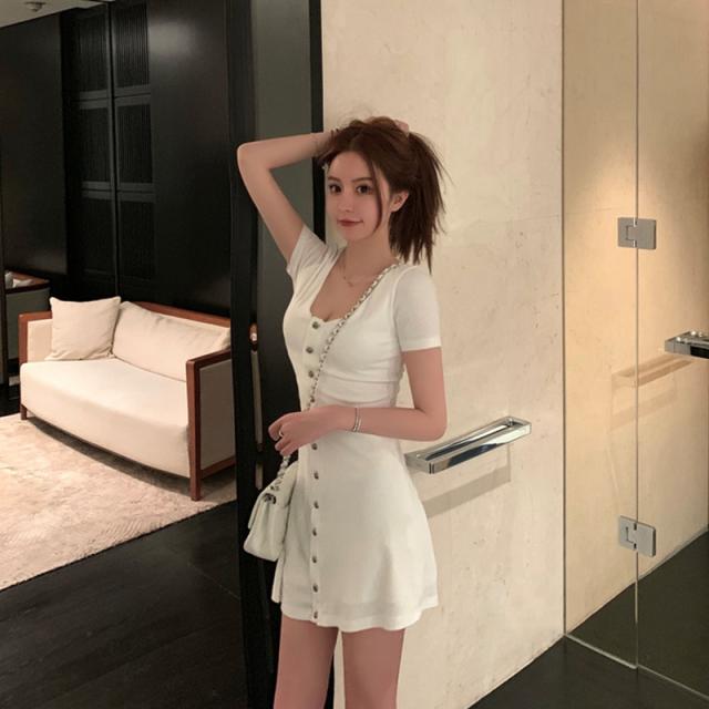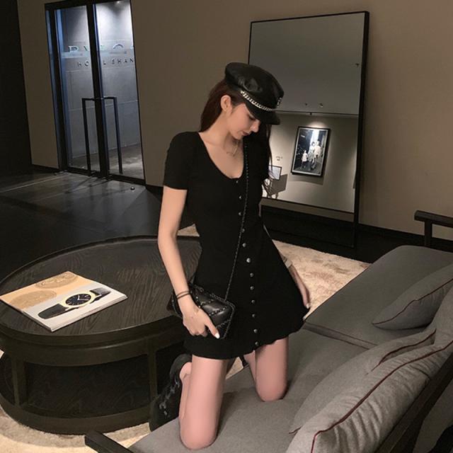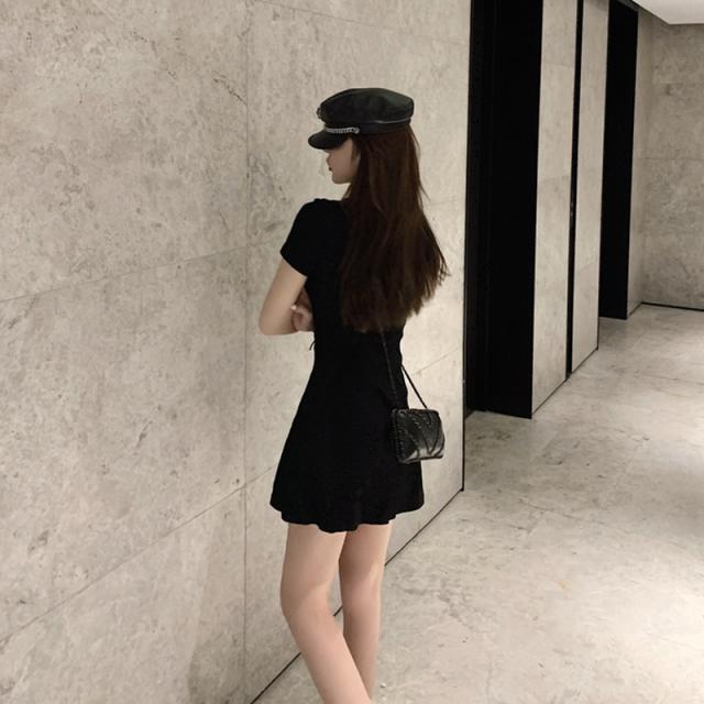 サマー着痩ワンピース低身長ブラックシェイプアップウエストギャザーショートスカートセクシー系スキッパー襟レディース