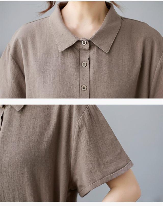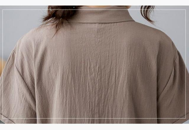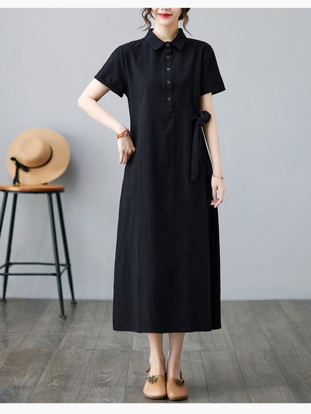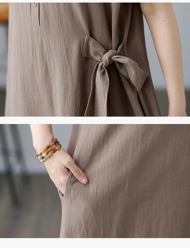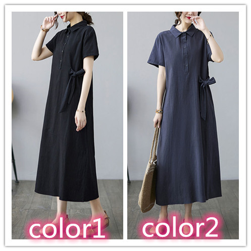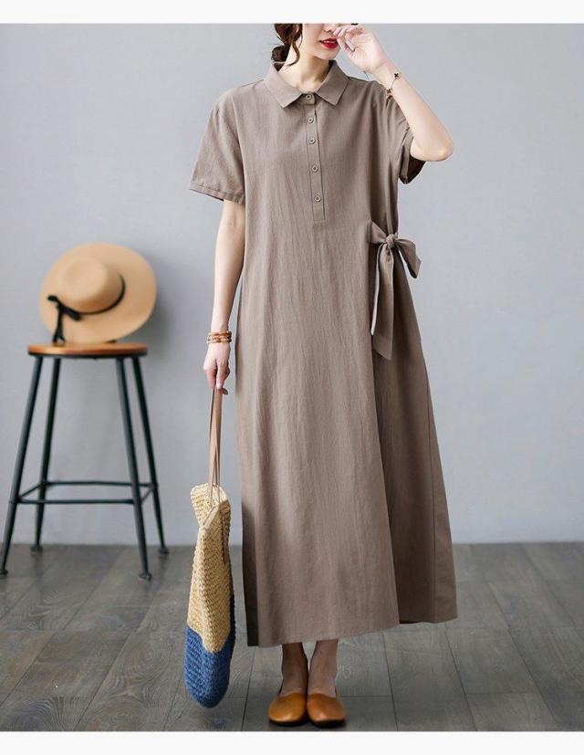 綿麻リボンタイ半袖ワンピースマキシスカート大きいサイズオーバーサイズ夏服着痩無地スタイリッシュカジュアル