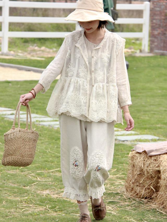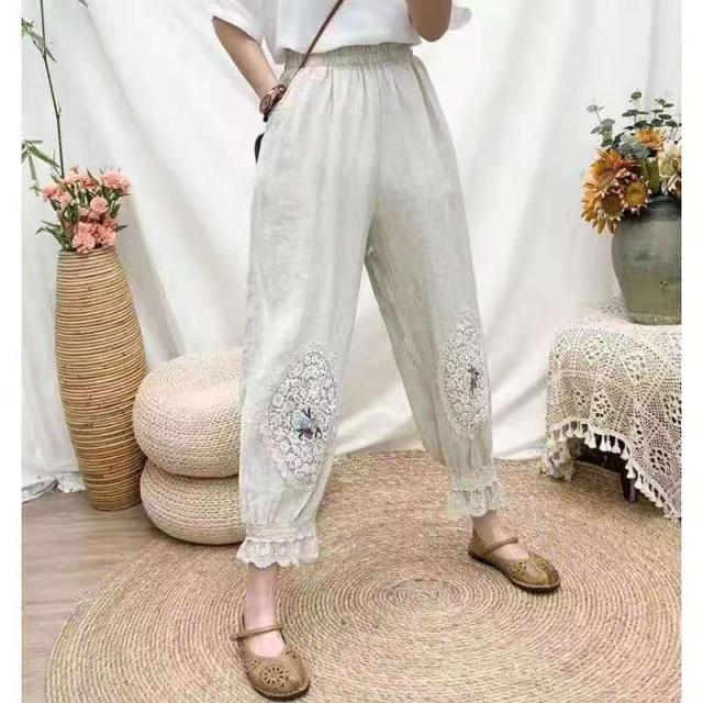 バルーンパンツウェストゴムレース切替九分丈パンツルーズ可愛らしいカジュアル花柄春夏物夏秋