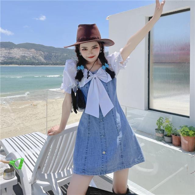 ワンピースリボンバルーンスリーブデニムスカート低身長台形スカート着痩サマーおしゃれレディース