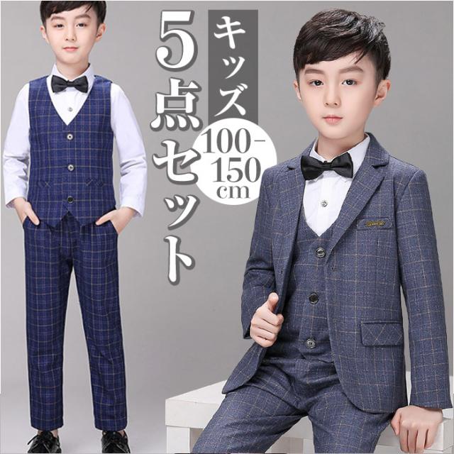 キッズ フォーマルスーツ 男の子 5点セット 通販 子供スーツ 子どもスーツ スーツ フォーマル 男子 5点 セット チェック チェック柄 長ズボン 蝶ネクタイ ジャケット 白シャツ