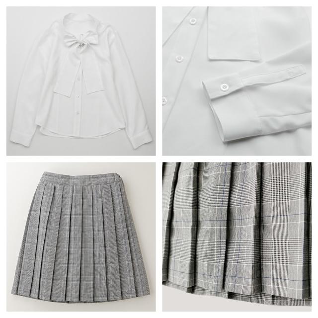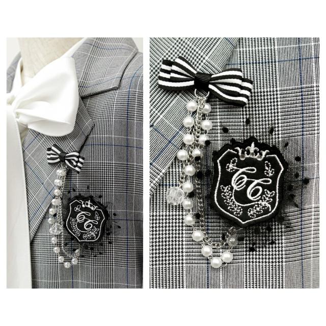 ジャケット、スカート、ボウタイブラウス、ブローチ