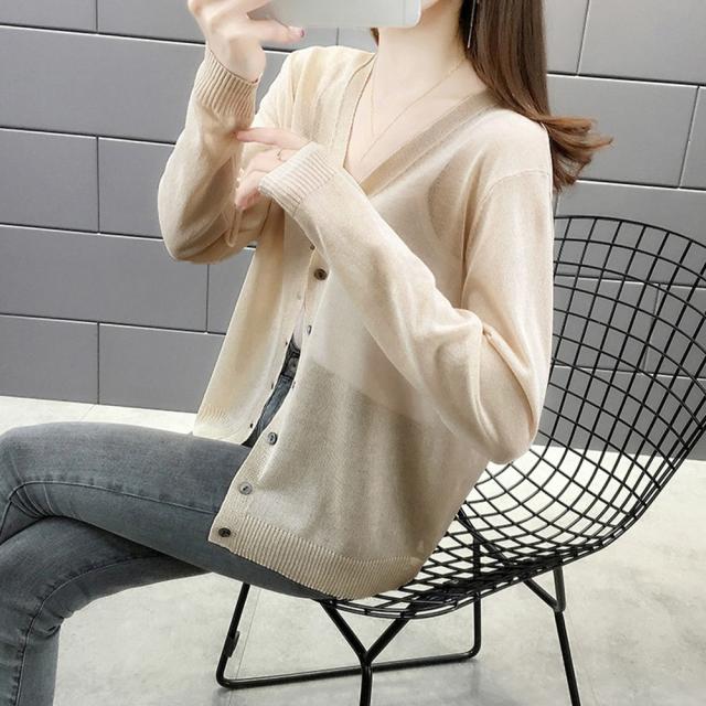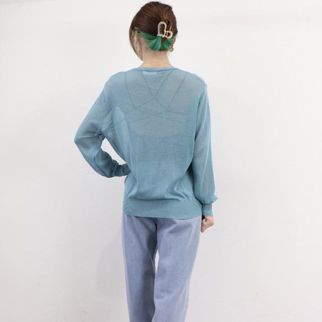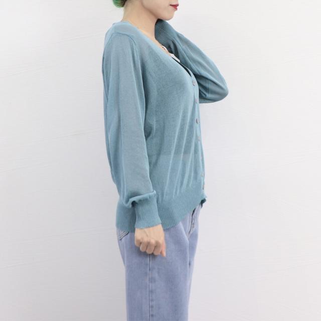 シアー仕様で涼しげ、首元をすっきりと見せて小顔見せもできるVネックシングルブレストカーディガン