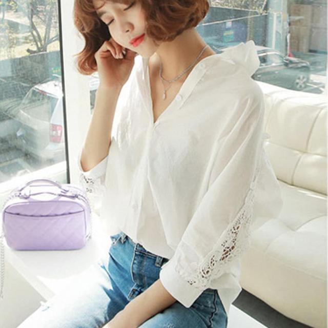 バックレースが涼しげで女性らしく可愛らしい印象のチュニックブラウス