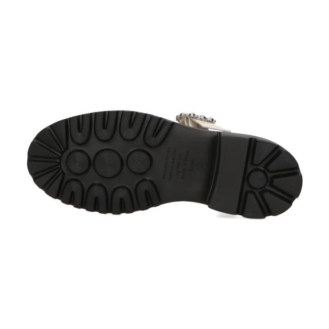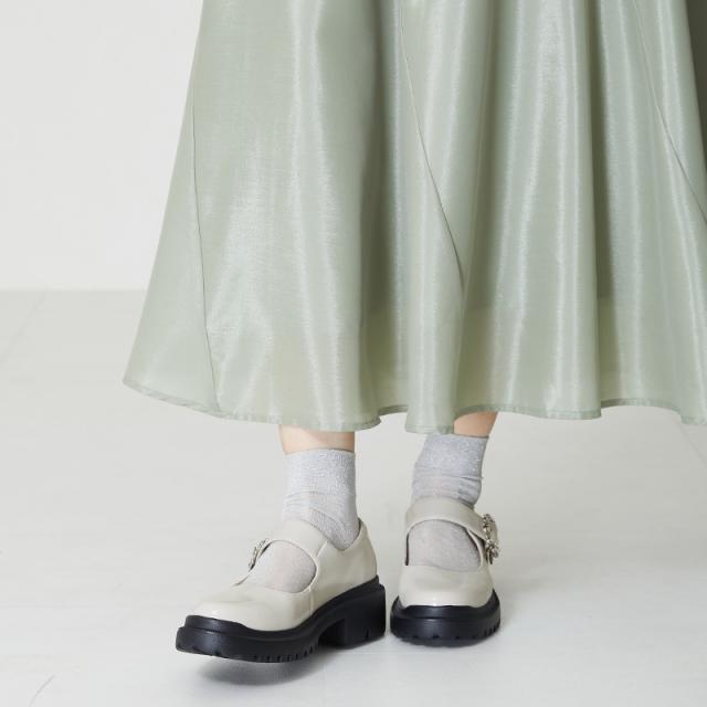 ラグジュアリーなビジューバックルにボリューム感のあるソールを合わせガーリーとカジュアルをミックスさせた