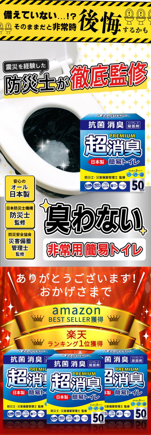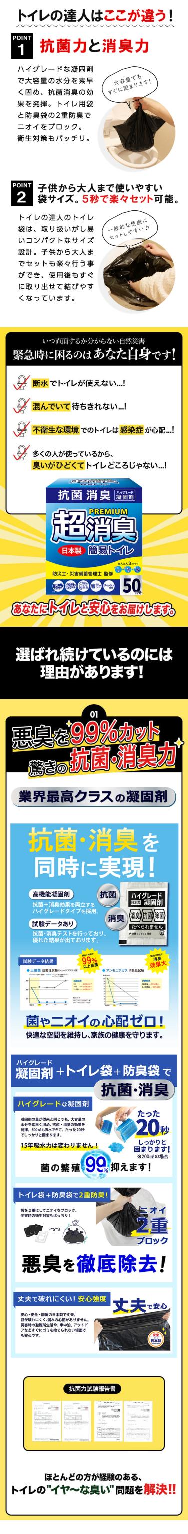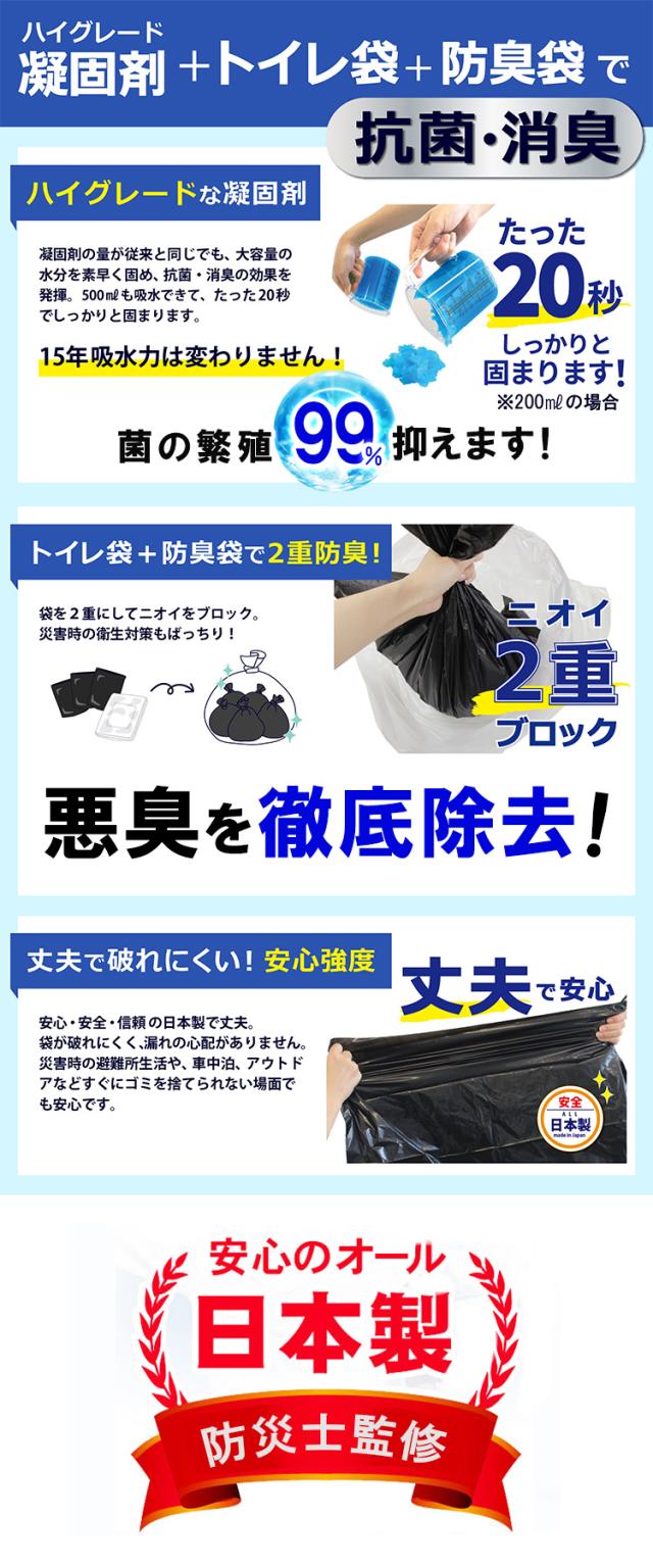| 商品特徴 | 国産製造で安心の品質。15年間長期保管。凝固剤+トイレ用袋+防臭袋で悪臭を徹底除去! |