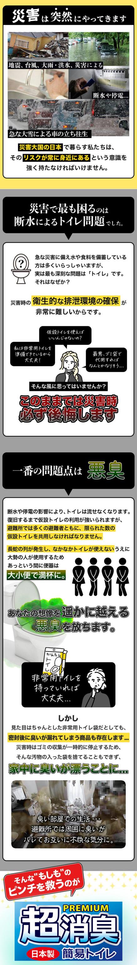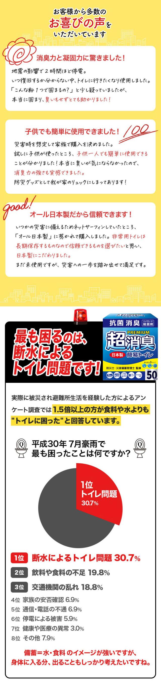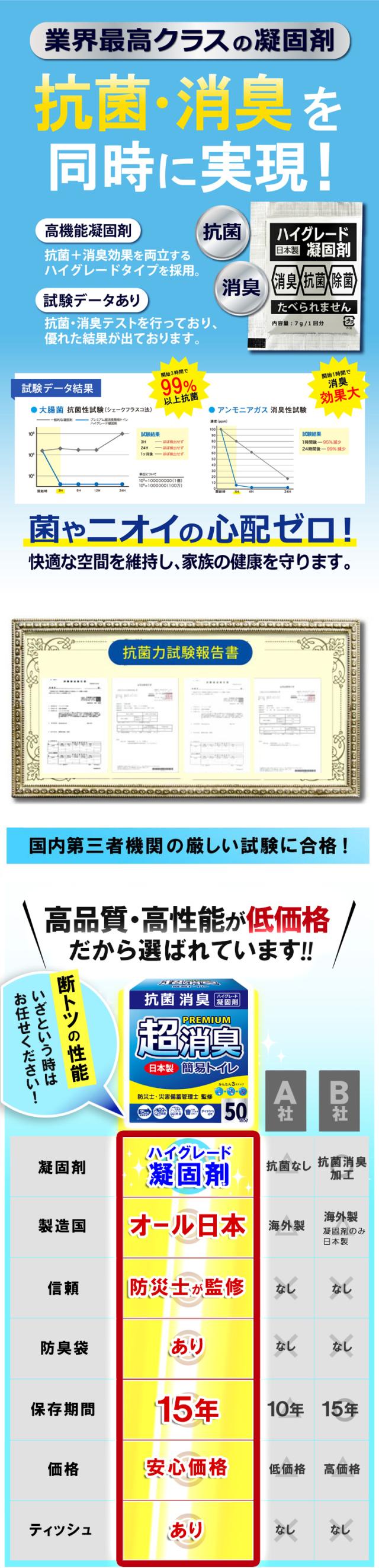 | 商品特徴 | 国産製造で安心の品質。15年間長期保管。凝固剤+トイレ用袋+防臭袋で悪臭を徹底除去! |