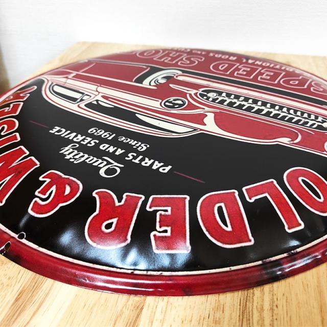かっこいいアメリカンな車がデザインされた丸形のブリキ看板です。