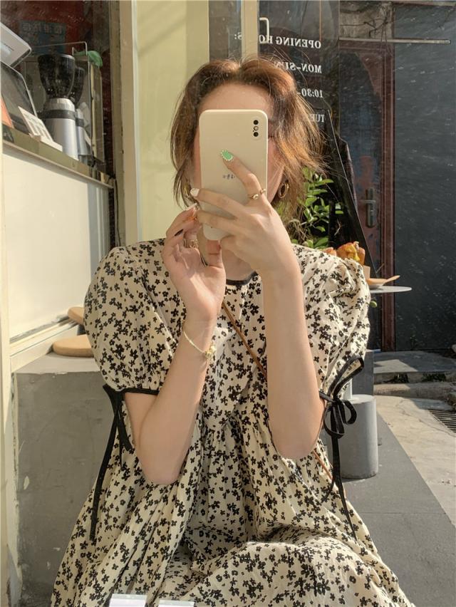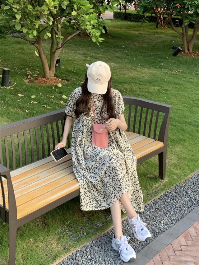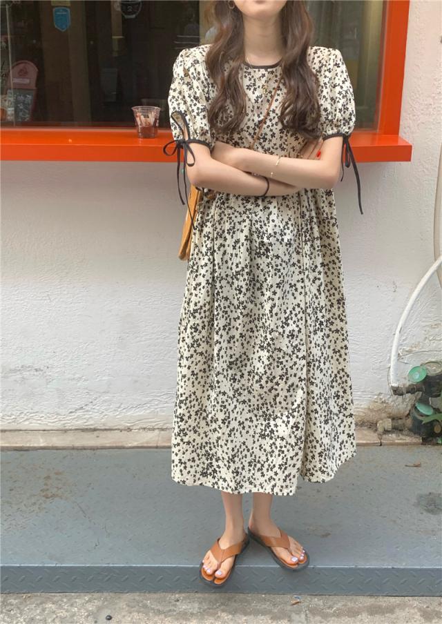 シフォンバルーン袖花柄ワンピースマキシワンピース大きいサイズレトロエレガント夏秋レディース
