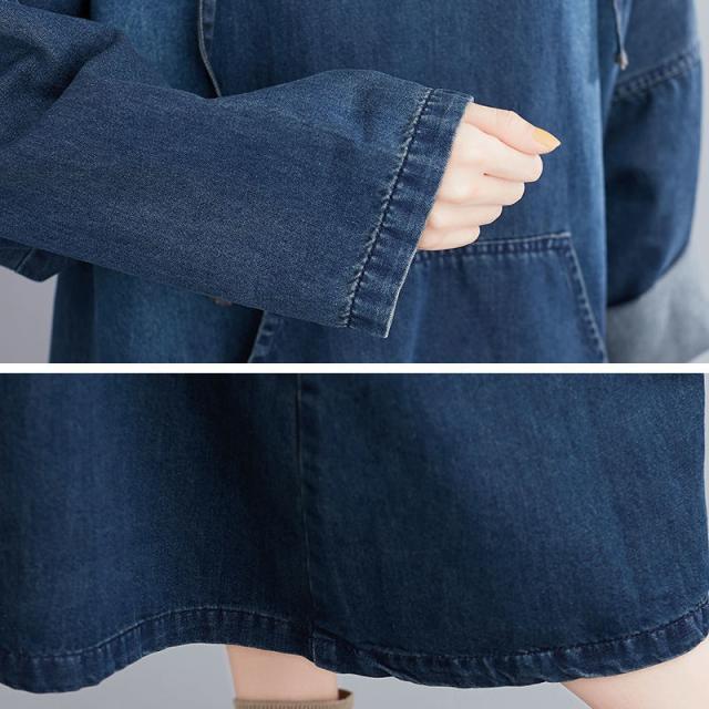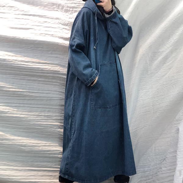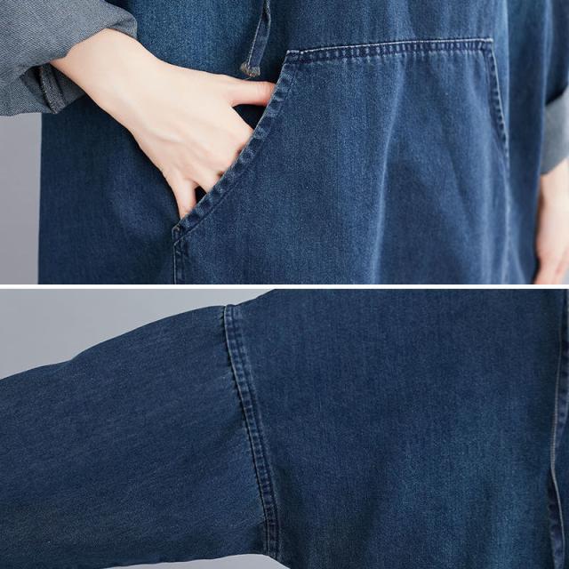 フーディー森ガールワンピースデニムスリッパ長袖大きいサイズゆったりヴィンテージ風秋冬物オリジナルカジュアル普段着