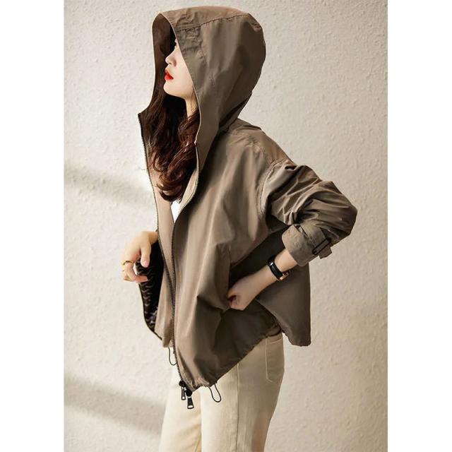 ライトアウターレディースフード付き春用ルーズアウターお洒落なデザインおしゃれジップアップショート丈エレガントスプリングコート