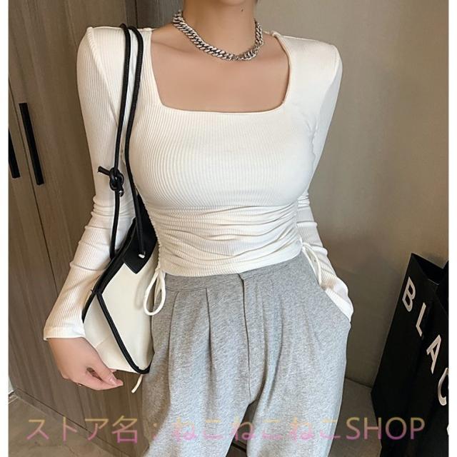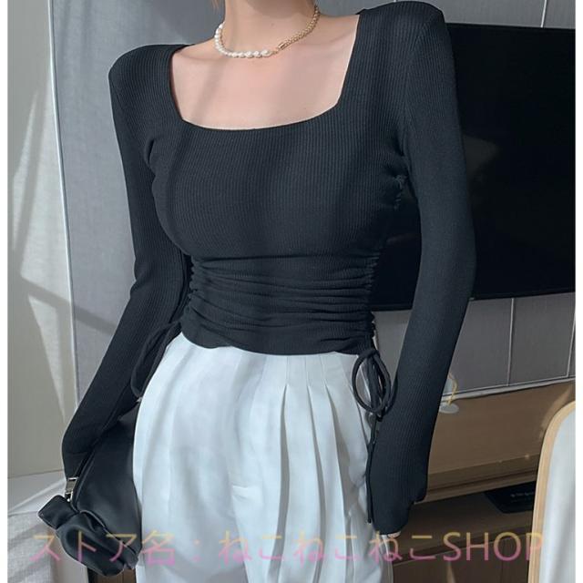 カットソー レディース 長袖 スクエアネック タイトトップス スリム 無地 ショート丈 へそ出し カシュクール 大人 コーデ 通勤 着痩せ 女性用 シンプル セクシー