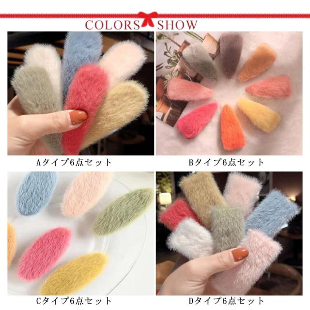 | 選べる6点セット、カラバリ豊富なビッグカラーヘアピンです。 秋冬の印象が与えられた、ふわふわの素材で、女性らしさUP! 大きめのサイズ感と淡い色合いで、カジュアルコーデの差し色にGOOD。 これひとつプラスするだけで即旬顔になれる今季マストアイテムです。 | |