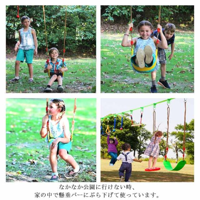 | お家でブランコ遊びができるキッズブランコが発売中。 座面の幅は大人でもきつくなくゆとりをもって乗ることができ、長さの調節がとても簡単です。 なかなか公園に行けない時、家の中で懸垂バーにぶら下げて使っています。 ロープも椅子もしかりしていて安心して遊ばせています。 持ち運び可能なのでアウトドアやキャンプなど様々なシーンで大活躍。 | |