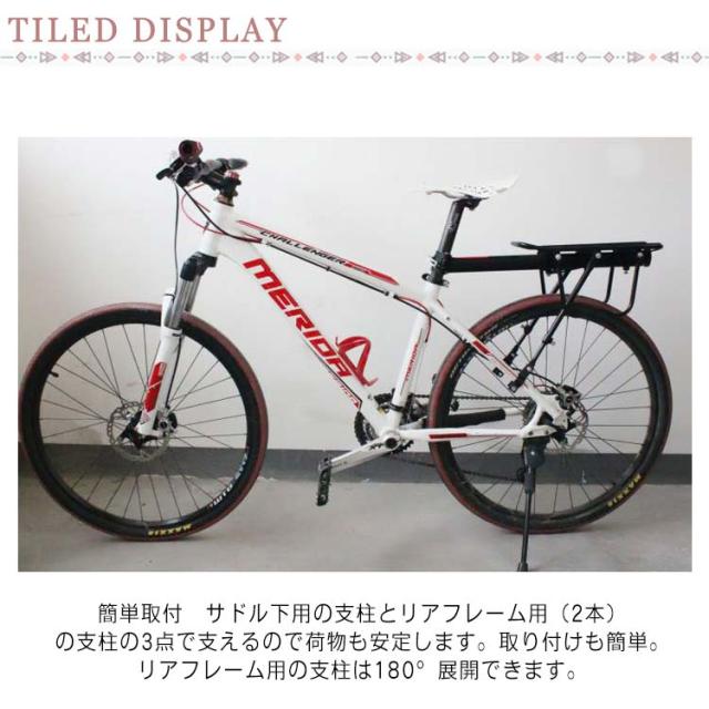 | 簡単取付 サドル下用の支柱とリアフレーム用(2本)の支柱の3点で支えるので荷物も安定します。取り付けも簡単。リアフレーム用の支柱は180°展開できます。 夜間安心 反射板付き、夜間でも安全です。 調整可能 荷台面がフラットで使い勝手がよく、安全性も抜群!さらにすライト式で自由に荷台の位置を調整可能です。 軽量 素材に軽量で強度の優れたアルミ合金を採用され。 | |