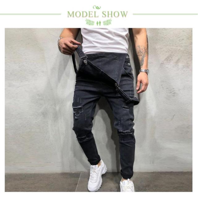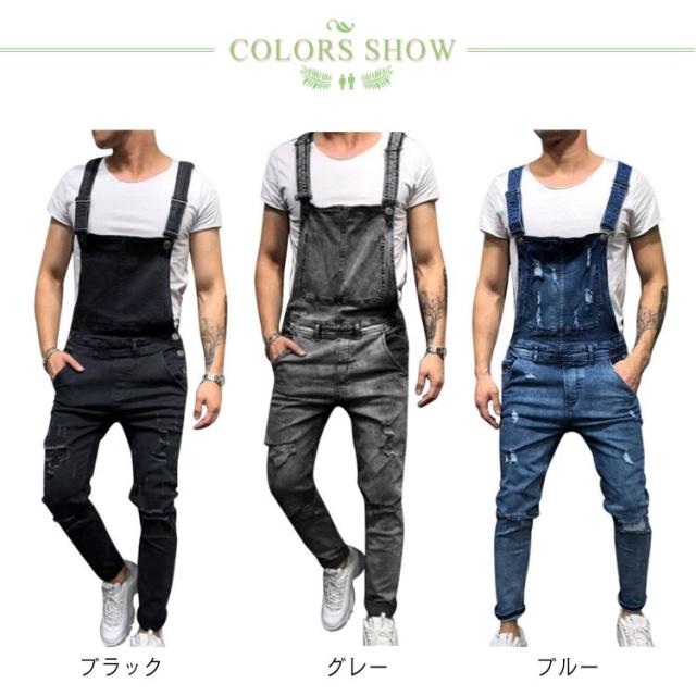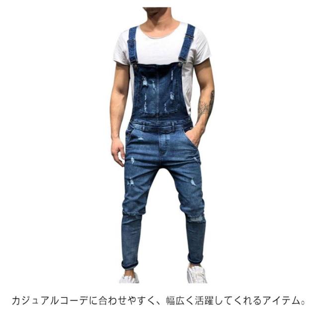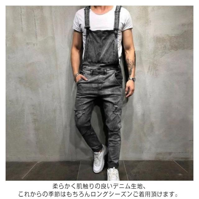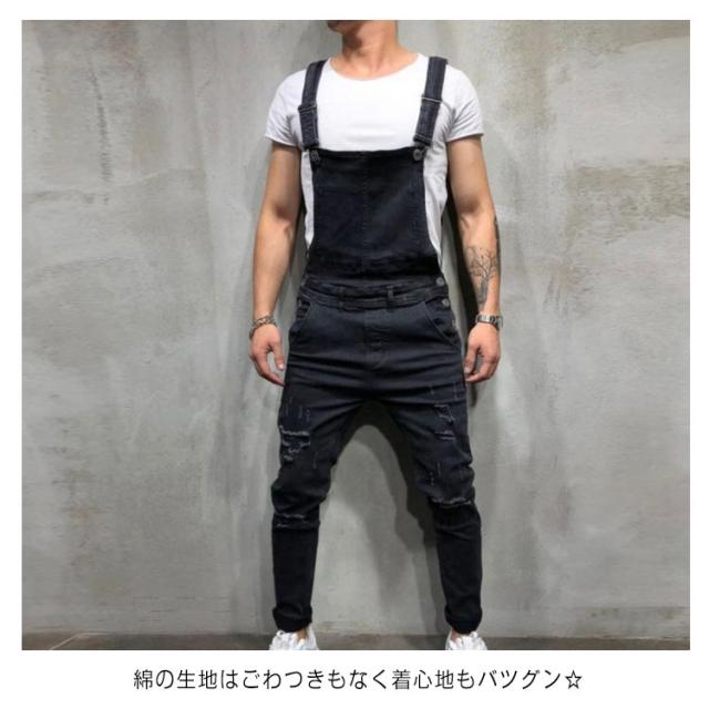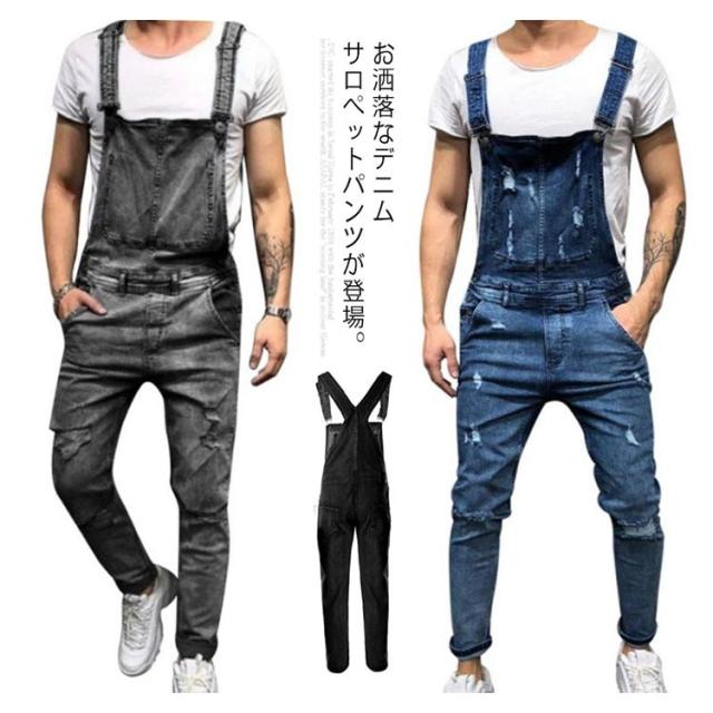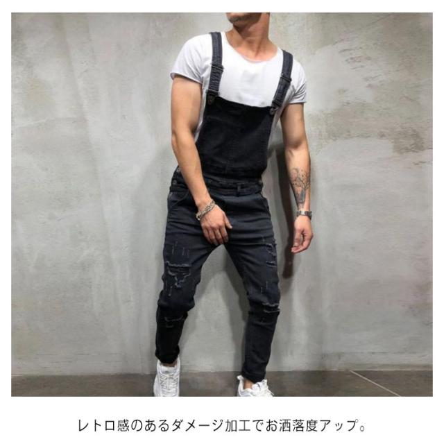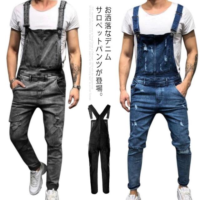 サロペットパンツ メンズ デニム オーバーオール ゆったり ダメージ加工 オールインワン デニムサロペット つなぎ 春 夏 秋 メンズファッション