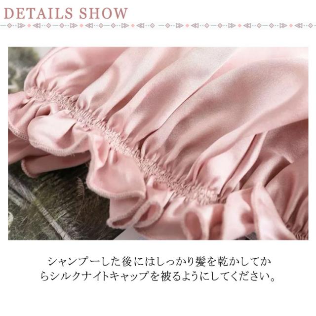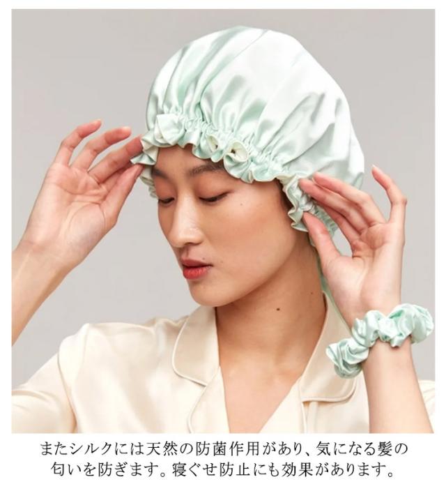 | 髪にうるおいを与えるシルクナイトキャップ 睡眠中の髪をしっとり保湿し、乾燥や刺激からからやさしく守ります。 人間のお肌に近いたんぱく質からできているシルク素材。 低刺激で髪やお肌が敏感な方にもおすすめです。 シルクは軽くしなやかなので、重みを感じません。 またシルクには天然の防菌作用があり、気になる髪の匂いを防ぎます。寝ぐせ防止にも効果があります。 被る時は髪をすべてシルクナイトキャップの中にいれます。 シャンプーした後にはしっかり髪を乾かしてからシルクナイトキャップを被るようにしてください。 | |
