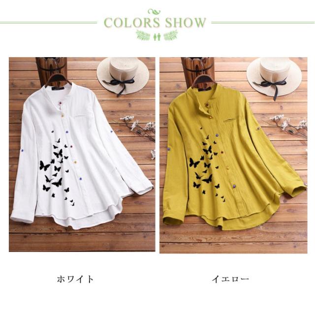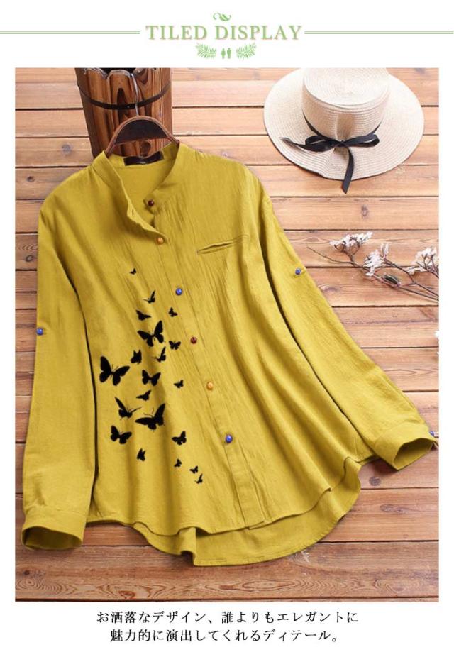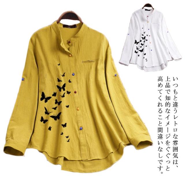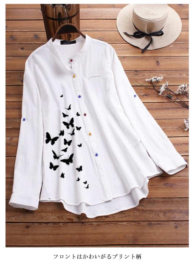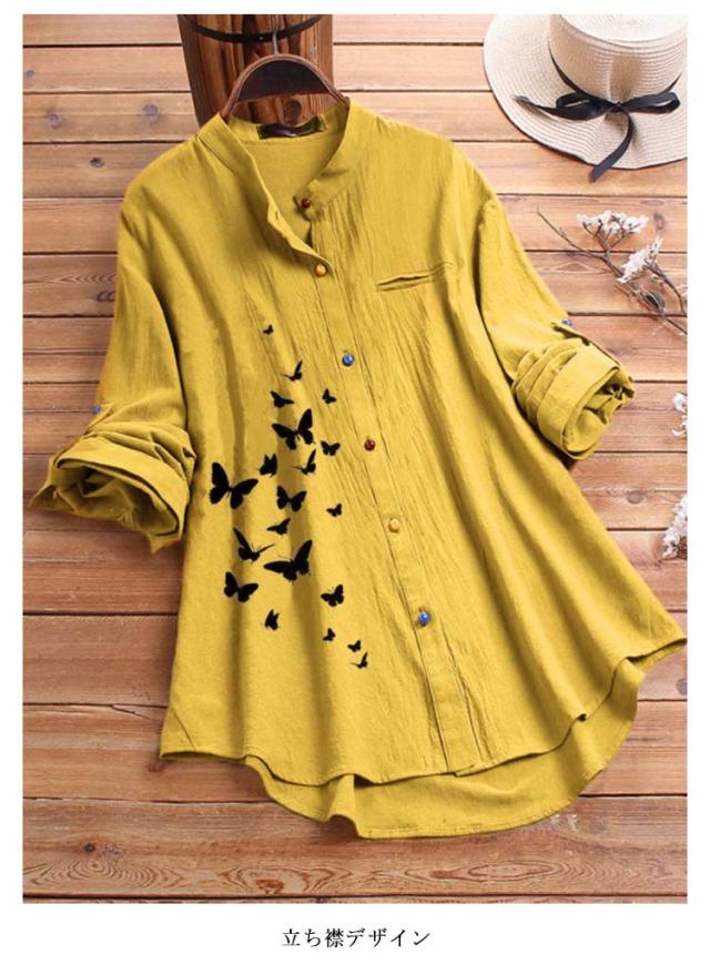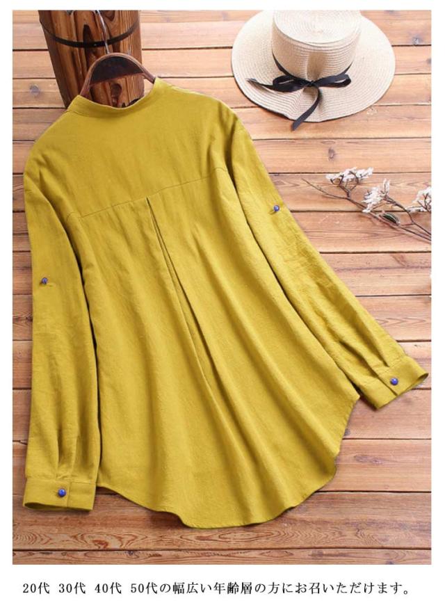 リネンシャツ ワイシャツ 立ち襟 レディース ブラウス 無地 長袖 春夏 チュニックシンプル プリント柄 おしゃれ 着痩せ 森ガール 上着 女性 日常 tシャツ 部屋着 通勤 新作 送料無料