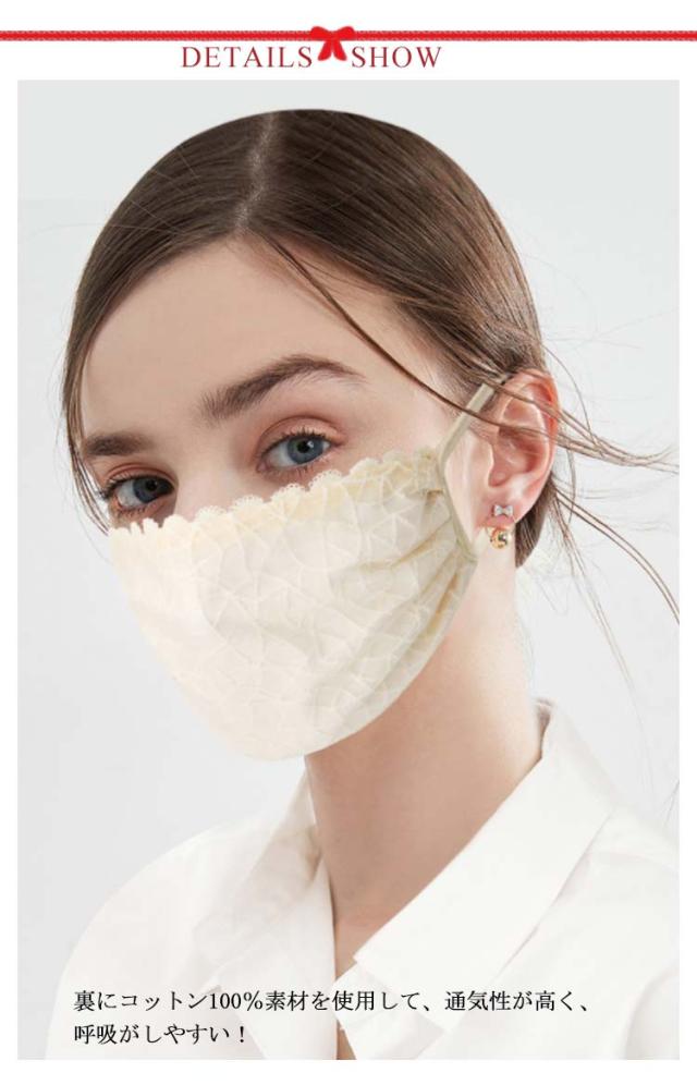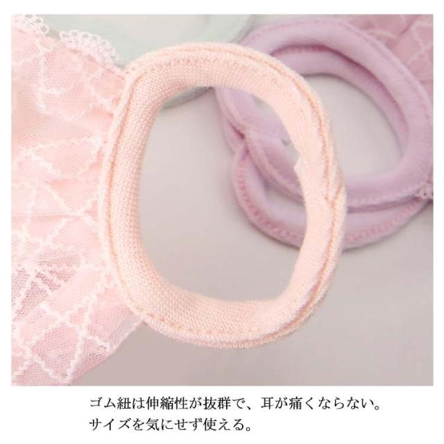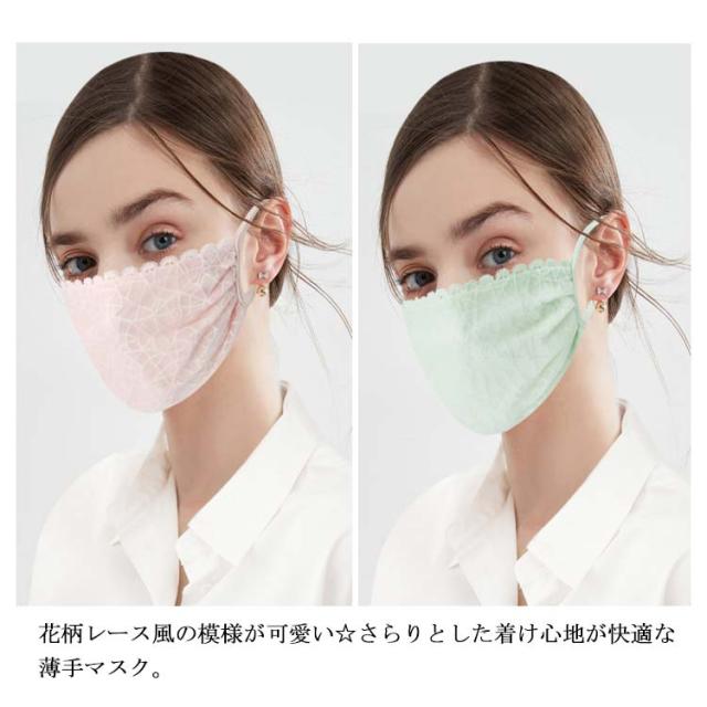 | 花柄レース風の模様が可愛い☆さらりとした着け心地が快適な薄手マスク。 通気性がよいため、マスクは息苦しくて苦手という方も安心。 立体的な形なので優しくお顔にフィットします。 | |