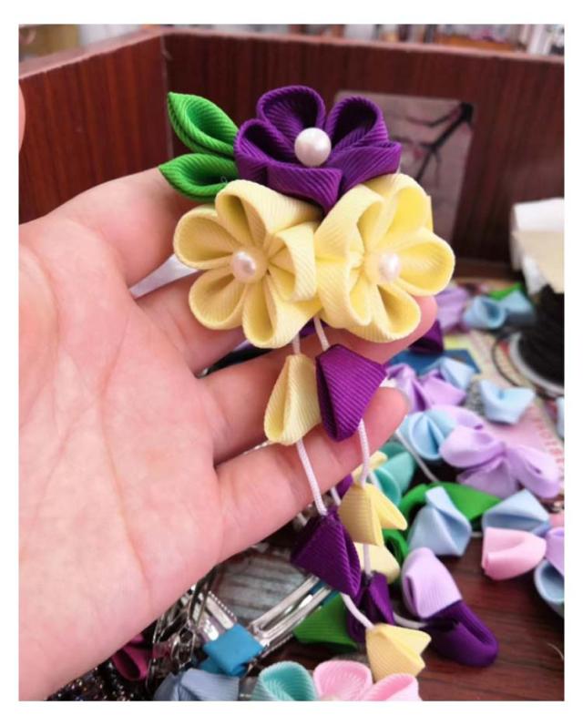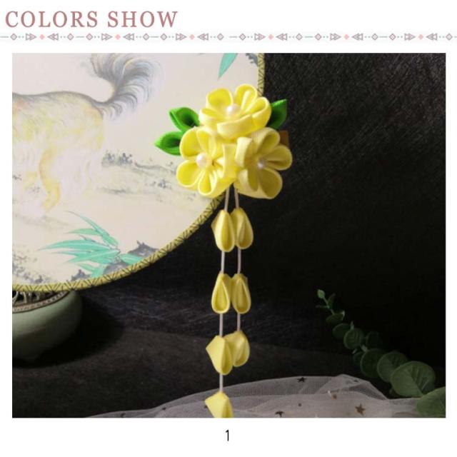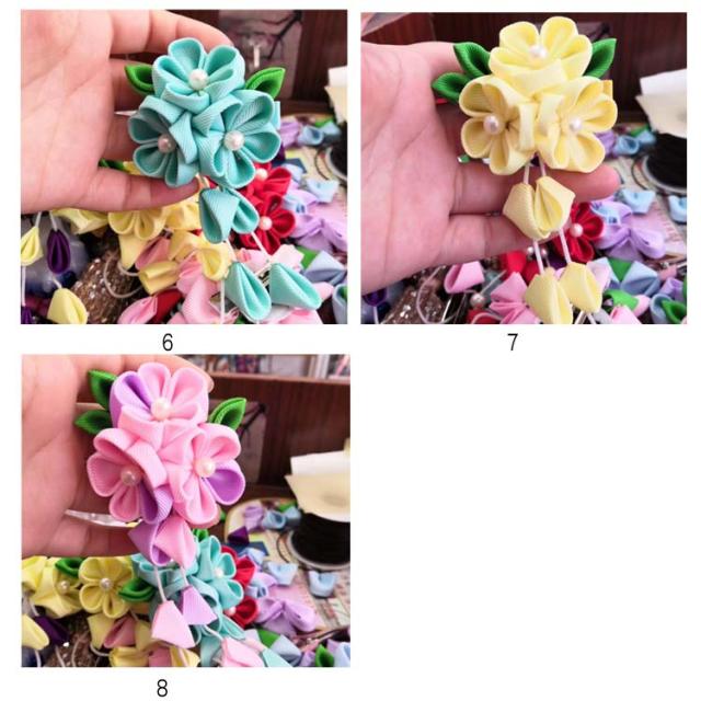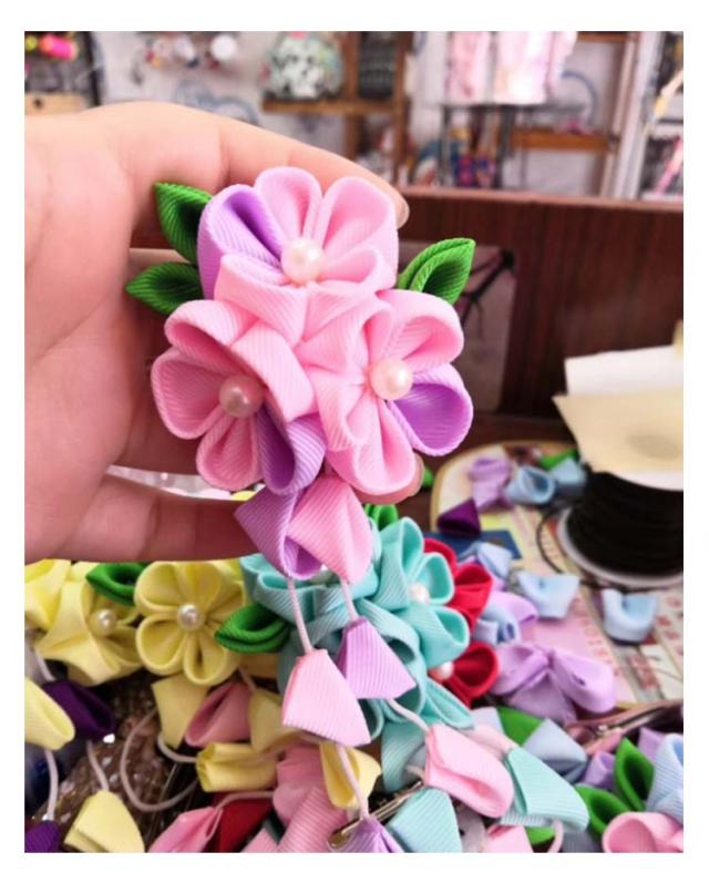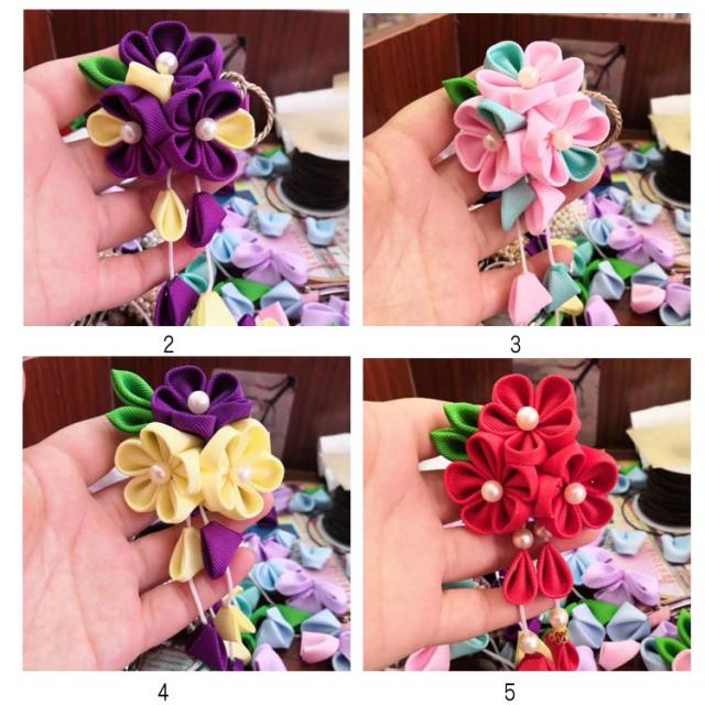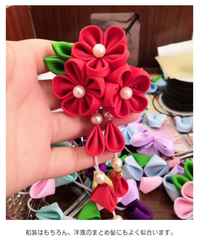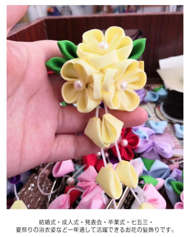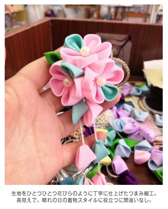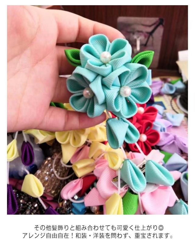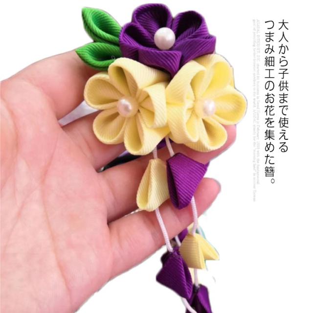 | 大人から子供まで使えるつまみ細工のお花を集めた簪。 生地をひとつひとつ花びらのように丁寧に仕上げたつまみ細工、高見えで、晴れの日の着物スタイルに役立つに間違いなし。 和装はもちろん、洋風のまとめ髪にもよく似合います。 その他髪飾りと組み合わせても可愛く仕上がり◎アレンジ自由自在!和装・洋装を問わず、重宝されます。 結婚式・成人式・発表会・卒業式・七五三・夏祭りの浴衣姿など一年通して活躍できるお花の髪飾りです。 | |