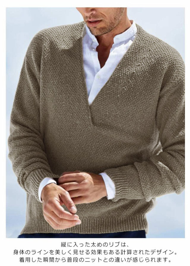 | 深めのVネックラインからインナーをのぞかせるレイヤードスタイルを取り入れる事で、コーディネートの幅も広がります。 カジュアルな中にも上品さを生み出すスタイリッシュなアイテムです。 縦に入った太めのリブは、身体のラインを美しく見せる効果もある計算されたデザイン。着用した瞬間から普段のニットとの違いが感じられます。 通気性、吸水性に優れ、体温を適度な温度で保ってくれるため、秋冬春と長い期間ご着用いただけます。 | |