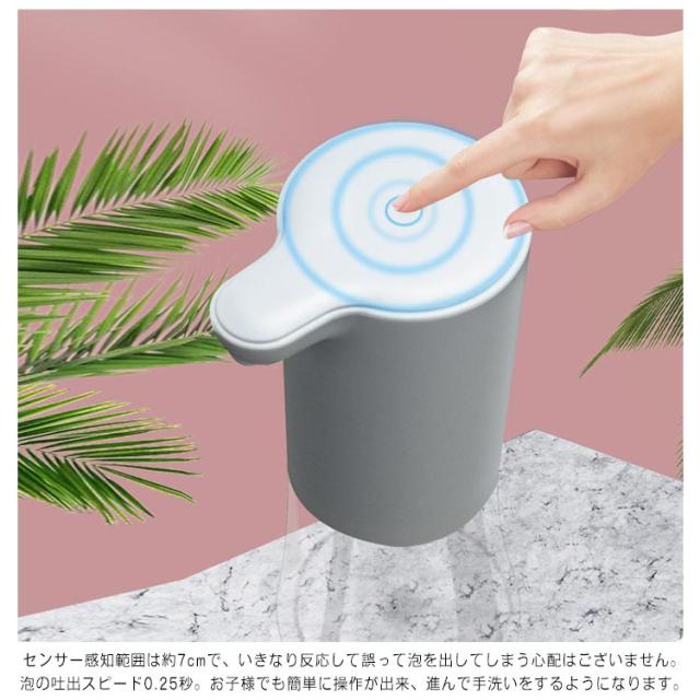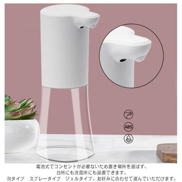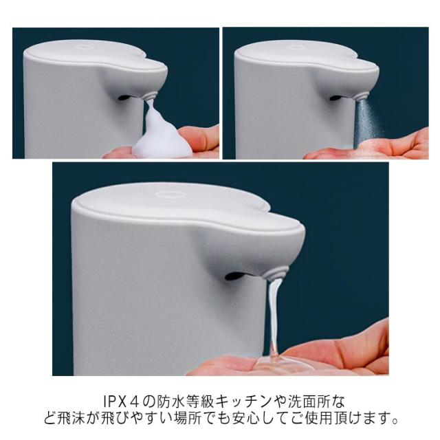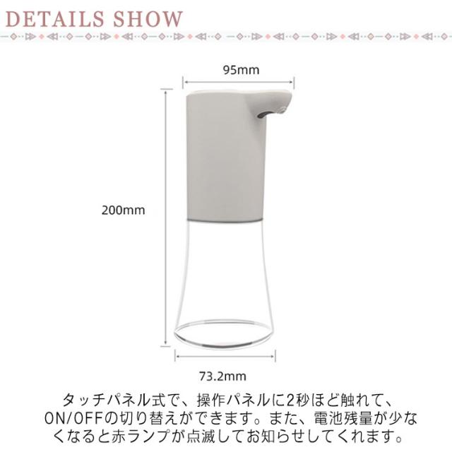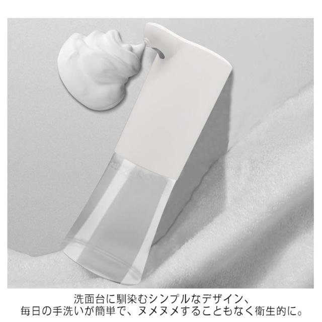 | 洗面台に馴染むシンプルなデザイン、毎日の手洗いが簡単で、ヌメヌメすることもなく衛生的に。 手をかざすだけの簡単操作、本体に触れず衛生的、自動で泡や液が出るのが楽しく。 センサー感知範囲は約7cmで、いきなり反応して誤って泡を出してしまう心配はございません。 泡の吐出スピード0.25秒。お子様でも簡単に操作が出来、進んで手洗いをするようになります。 ボトル部分は透明なので残量が一目でわかります。気分に合わせて色つきのハンドソープを交換して楽しむこともできます。 タッチパネル式で、操作パネルに2秒ほど触れて、ON/OFFの切り替えができます。また、電池残量が少なくなると赤ランプが点滅してお知らせしてくれます。 IPX4の防水等級キッチンや洗面所など飛沫が飛びやすい場所でも安心してご使用頂けます。 電池式でコンセントが必要ないため置き場所を選ばず、台所にも洗面所にも設置できます。 泡タイプ スプレータイプ ジェルタイプ、お好みに合わせて選んでいただけます。 | |