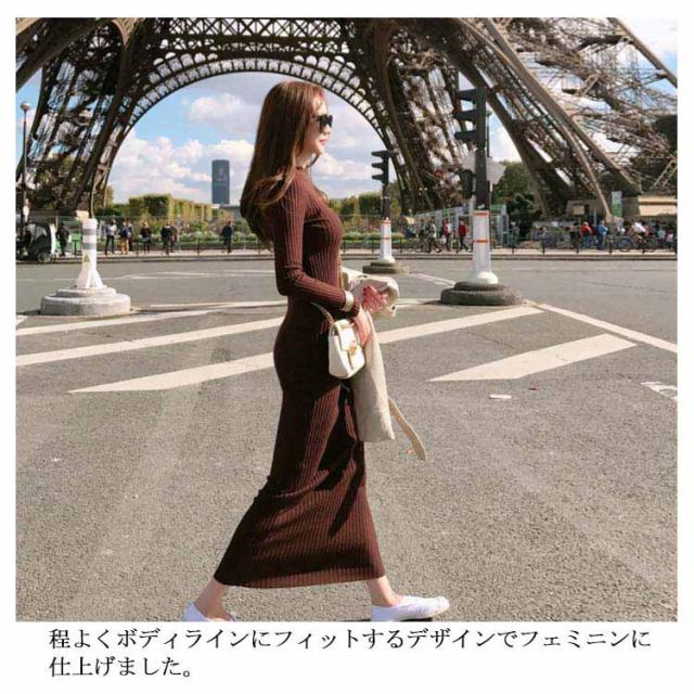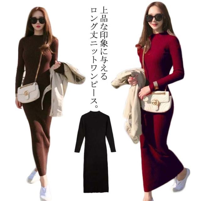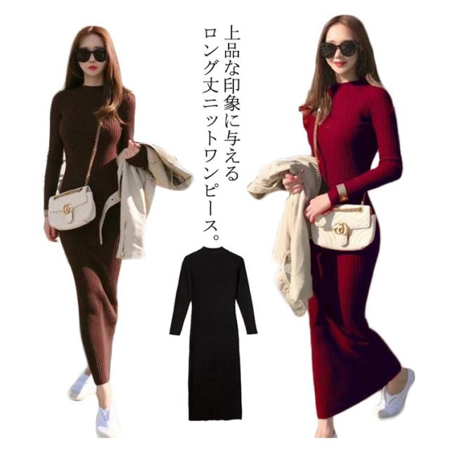 ニットワンピース レディース ロング丈 長袖 リブ ワンピース ニット フェミニン クルーネック リブワンピース タイト すっきり 可愛い 大人 女っぽ 着痩せ 細見え シンプル S M L XL